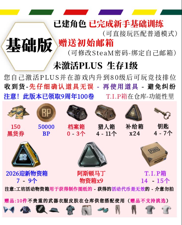 基础版=已过训练+150卷+5万BP+9个马丁物资箱