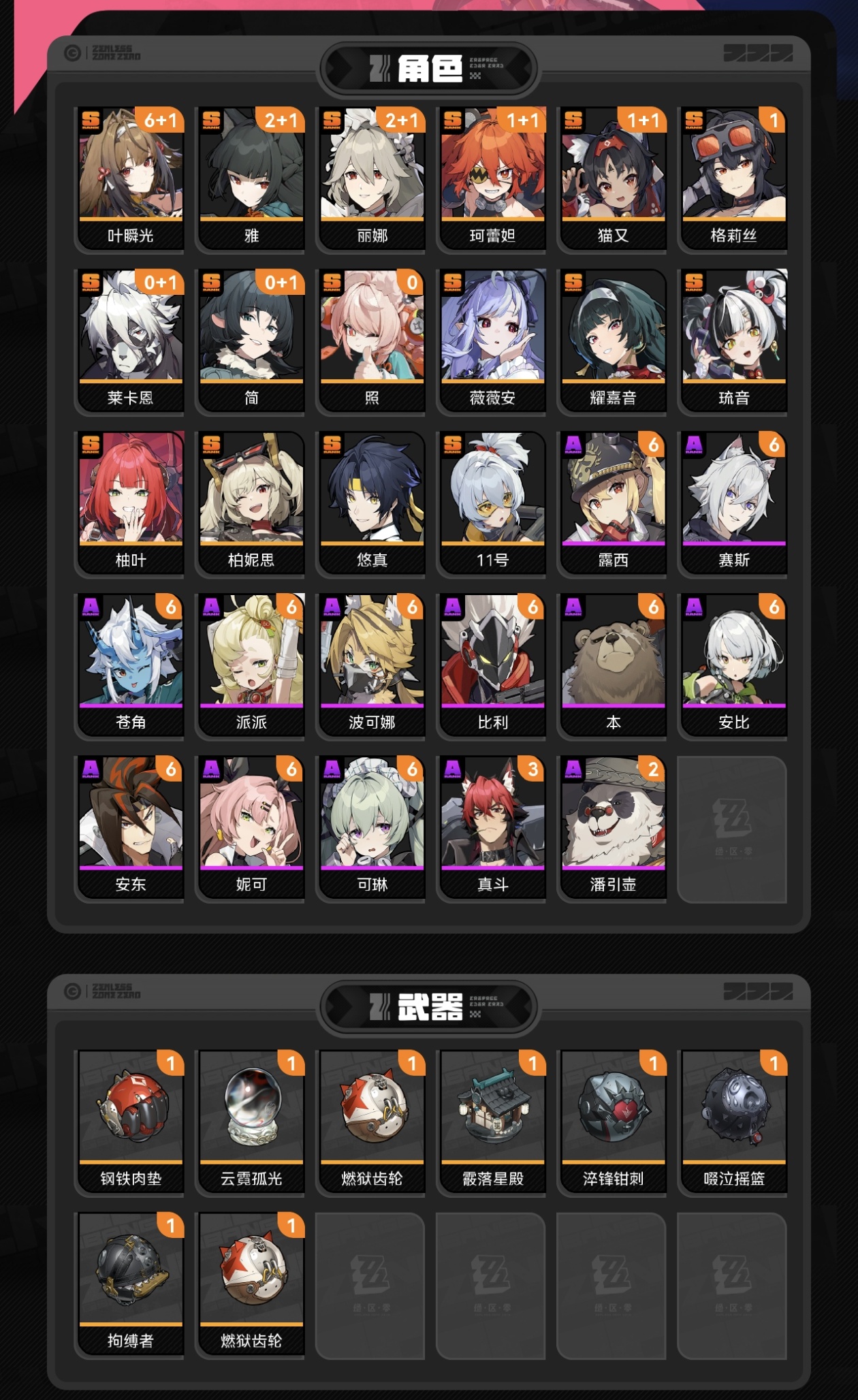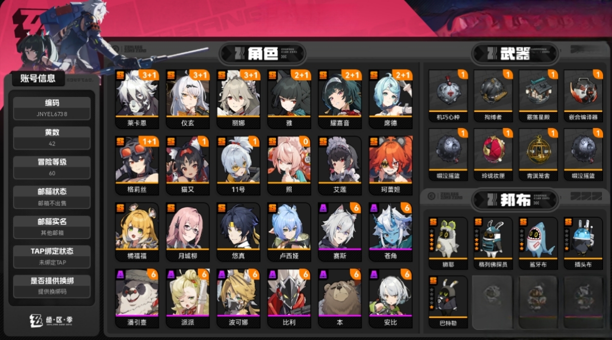 绝区零崩铁连体号,绝区零60级;50黄;菲林底片:884;菲林:6636;加密母带:28;24个S级代理人。崩铁:70级,女主,86黄,梦华668,星琼14566,星轨专票17,31个五星角色