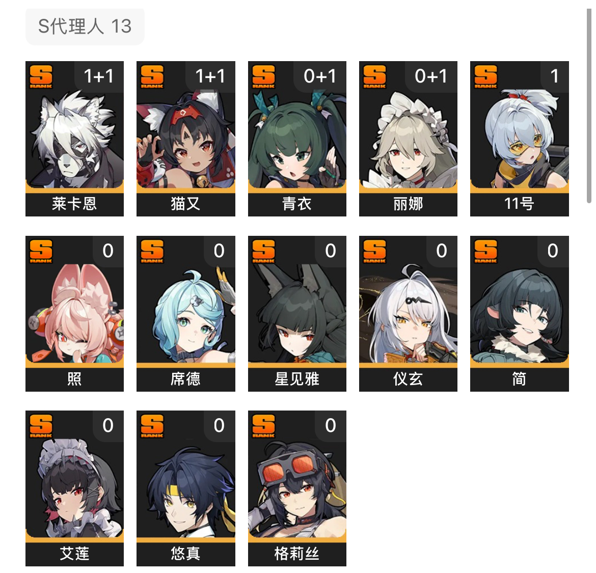13个S级代理人,5个S级音擎,29个菲林,4个S级邦布