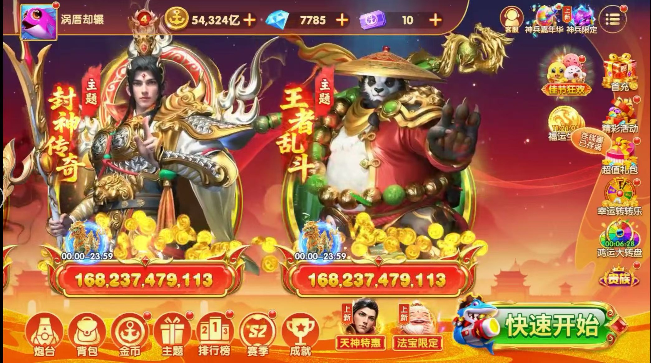 v7炮台2.8亿三级万象,带四圣天王女神上古神王皮肤带号出