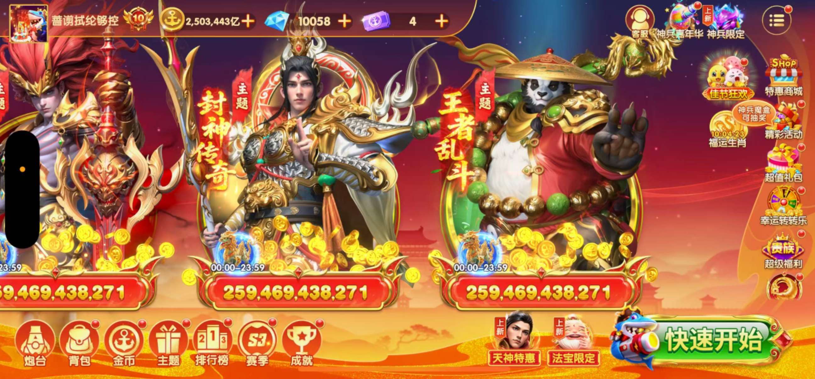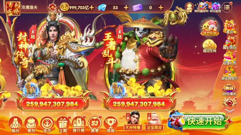 乐乐捕鱼极品V10差一千到11,所有的武神全满,青龙刀三套也全满,满炮极品最高900多万亿,满炮号。
