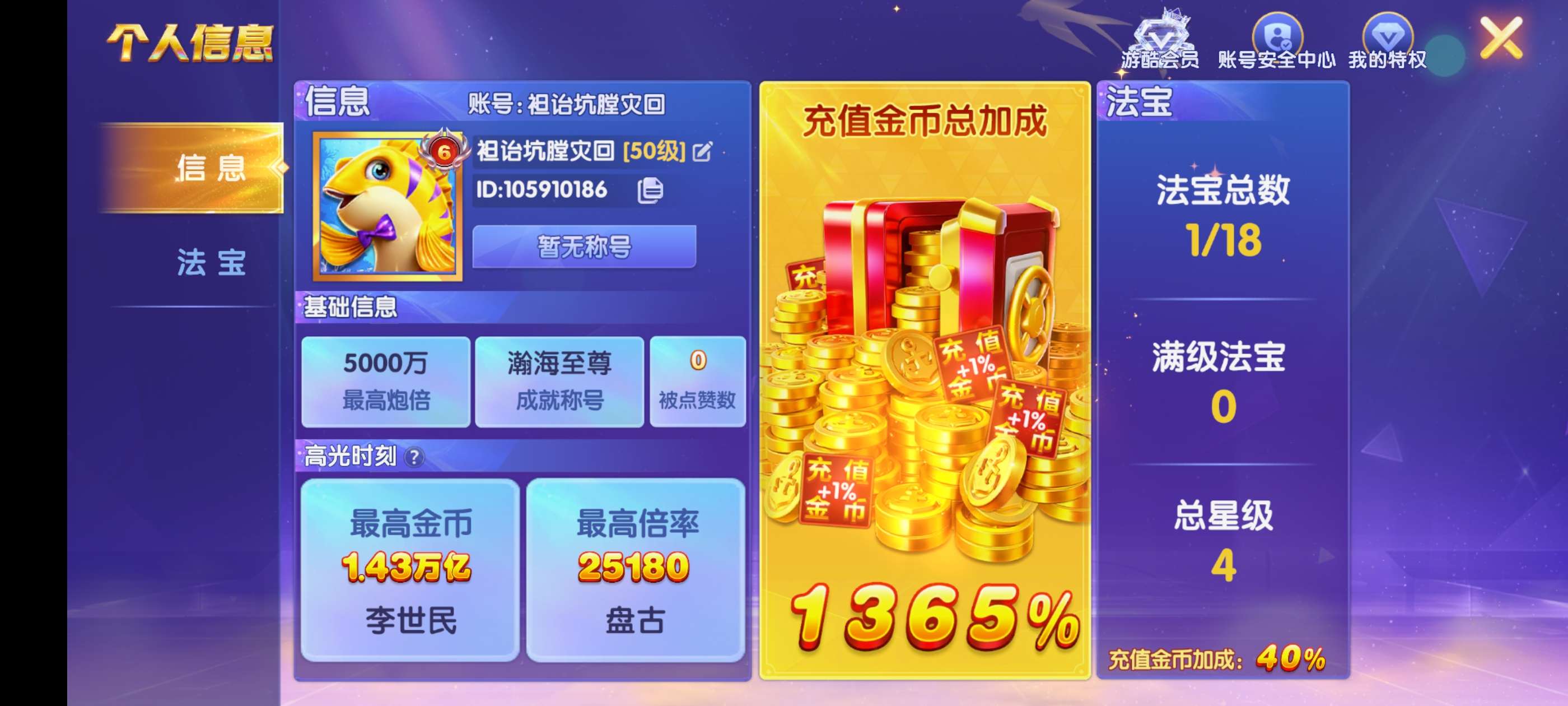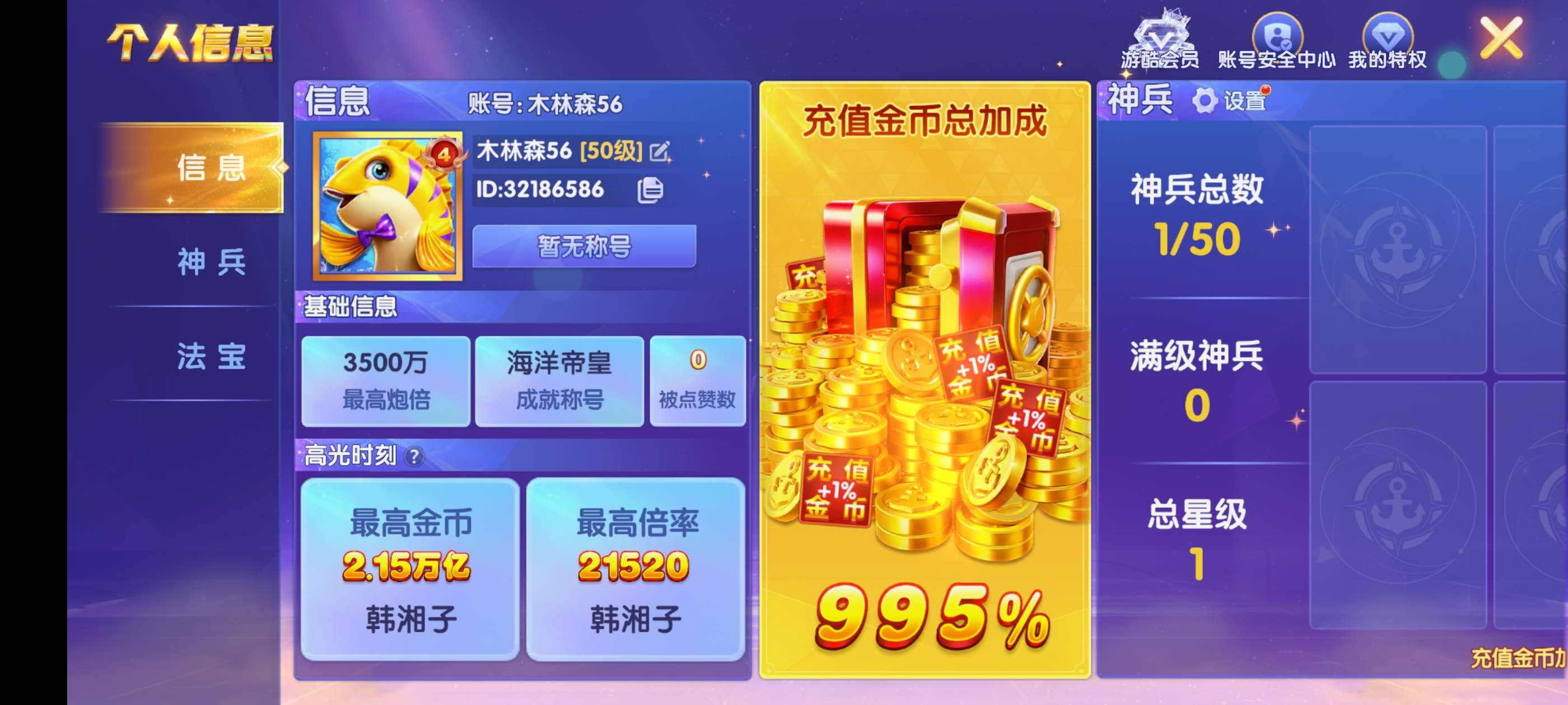 乐乐捕鱼vip5+226万亿金币+3.2亿实炮!4级万象!3个羁绊!已解绑带号一起出