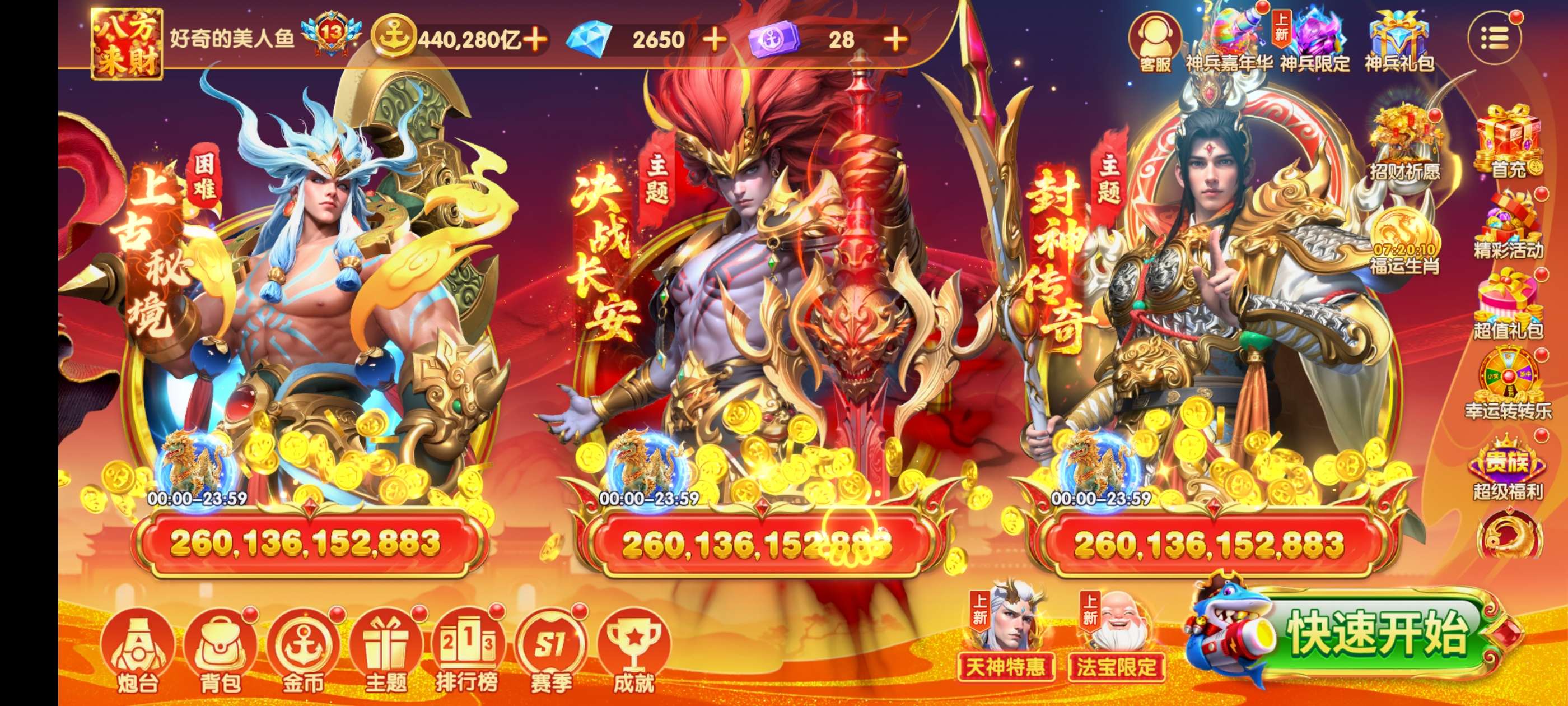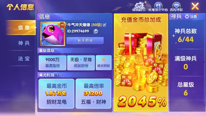 乐乐捕鱼V5 14.9万亿四大天王6阶|女神联盟6阶|四圣之力3阶