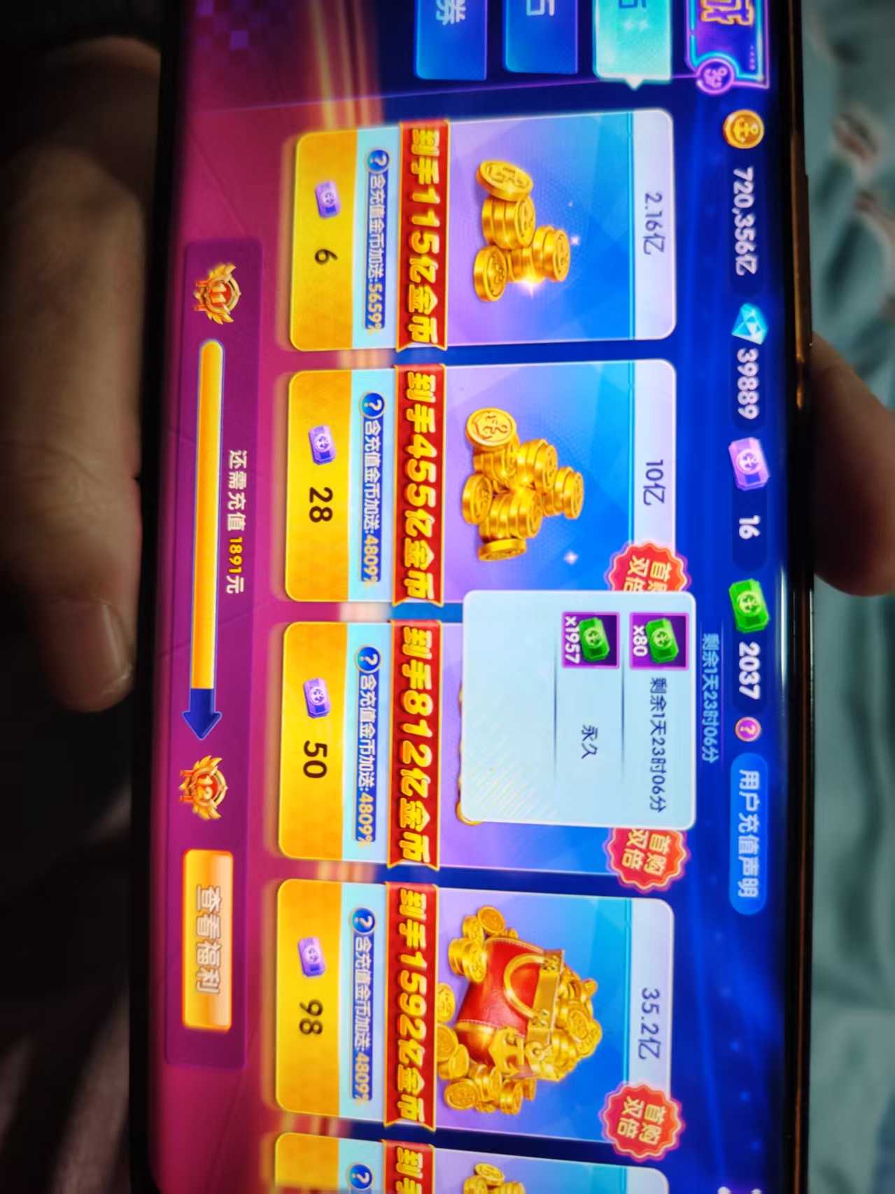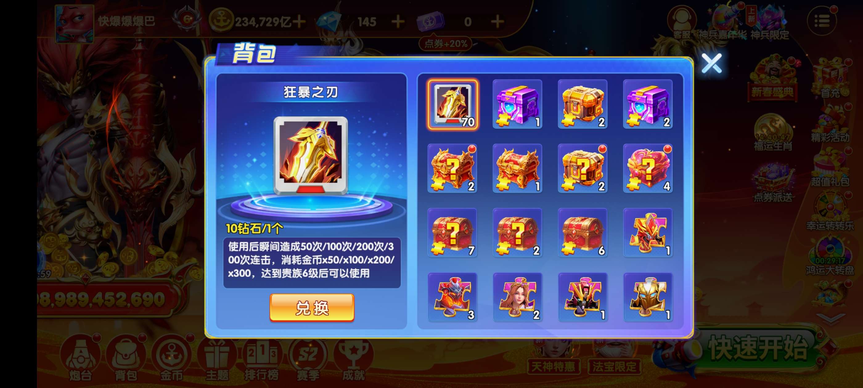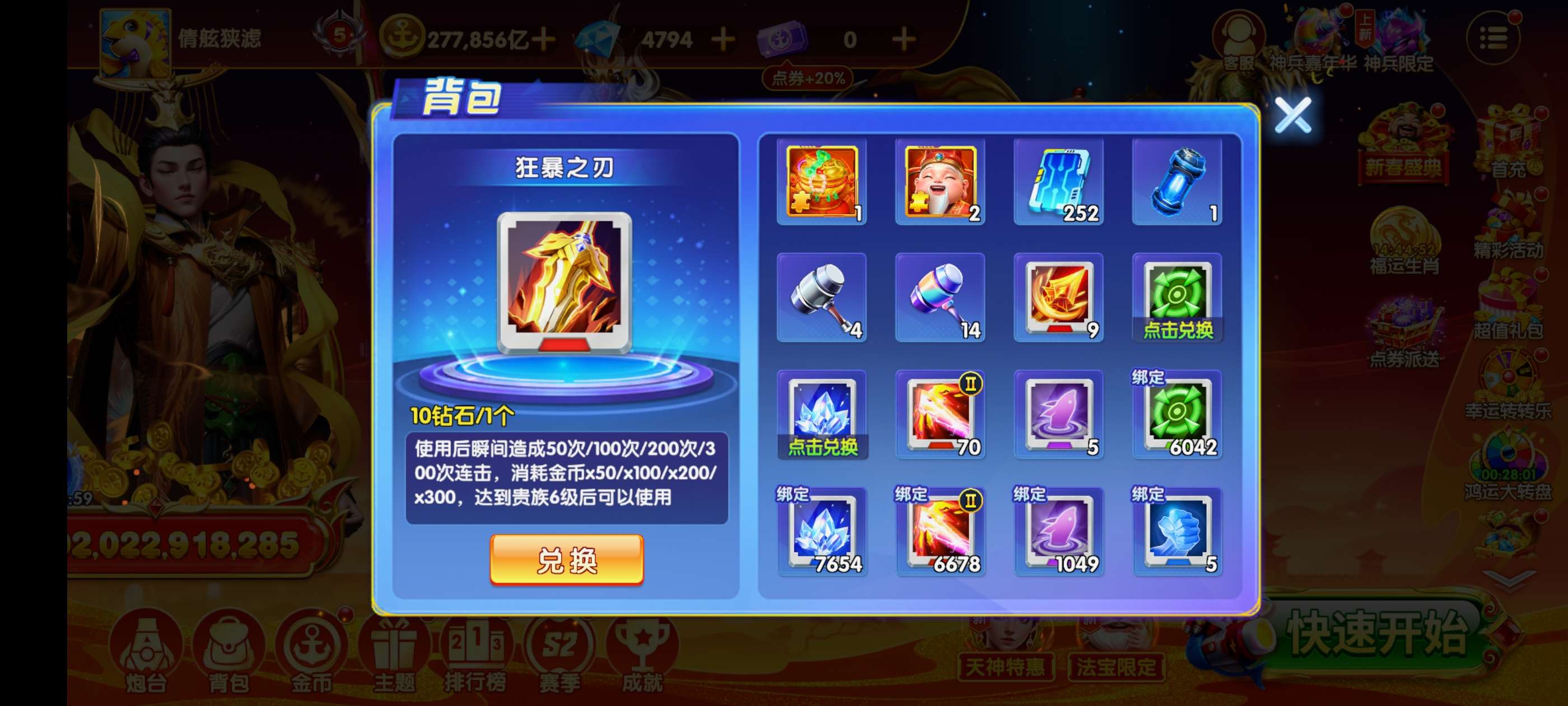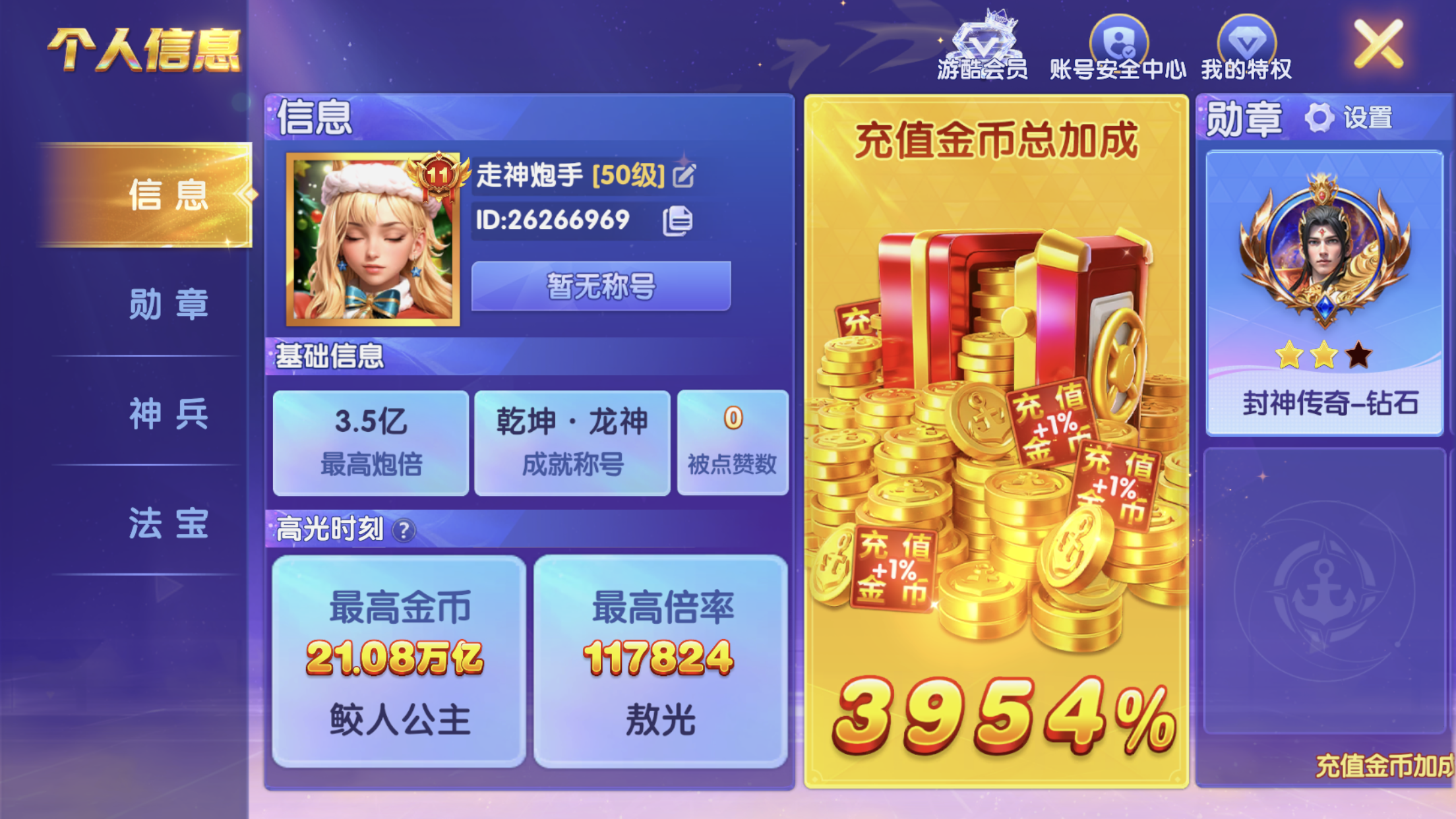 乐乐捕鱼扩大版荣耀账号V7,6万万亿金币,280亿炮,多武神道具。