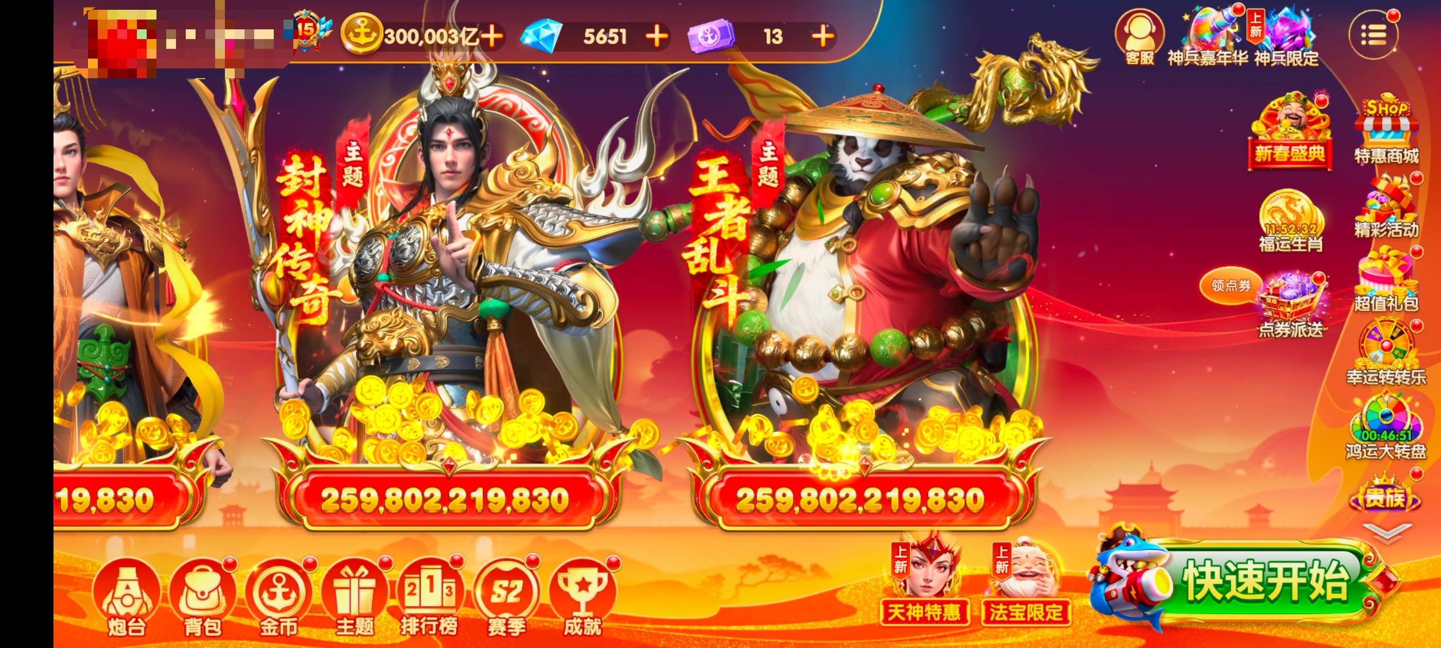 V15,30万亿,四圣、女神、天王、大唐、乱世全满星,实炮4.5亿,限时6.5亿,娱乐出分!