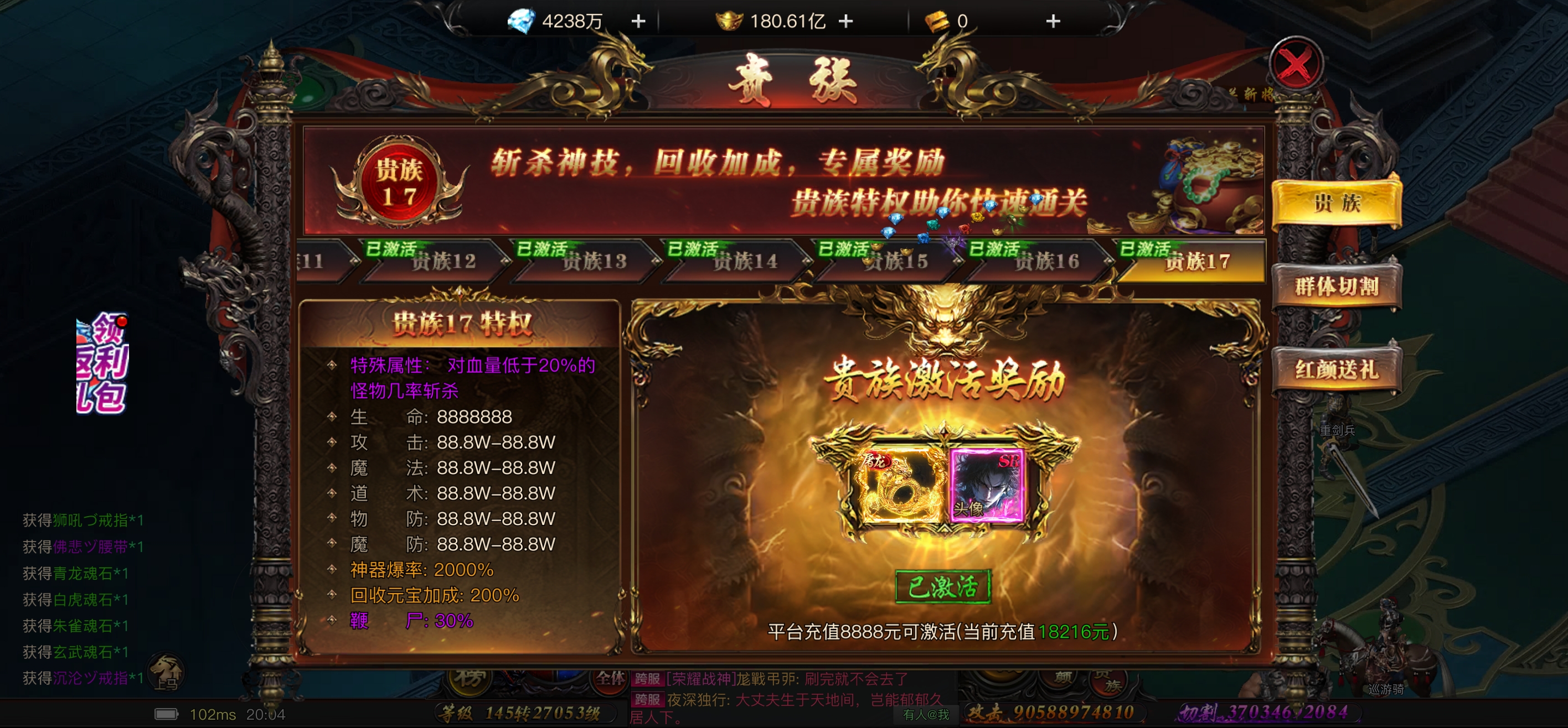 150转30000级,特权拉满,屠龙,裁决,凤凰,50天精品号,征战18057
