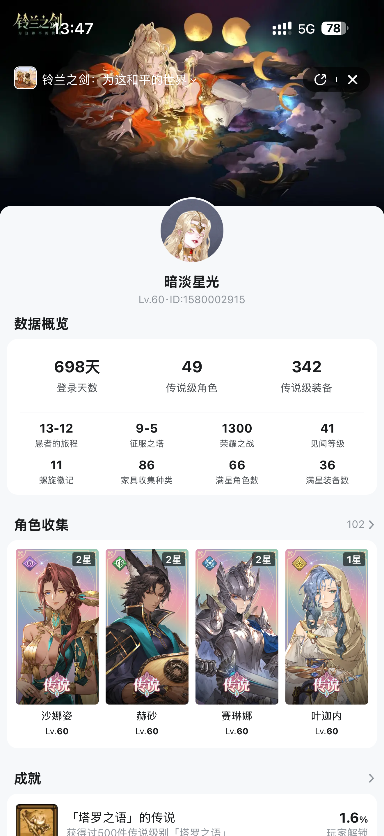 铃兰之剑国服60级号,双T0,4星露卡玛尔,3星SP伊南娜,13传说角色,沙姆斯,4星猎魔人,黑羽等
