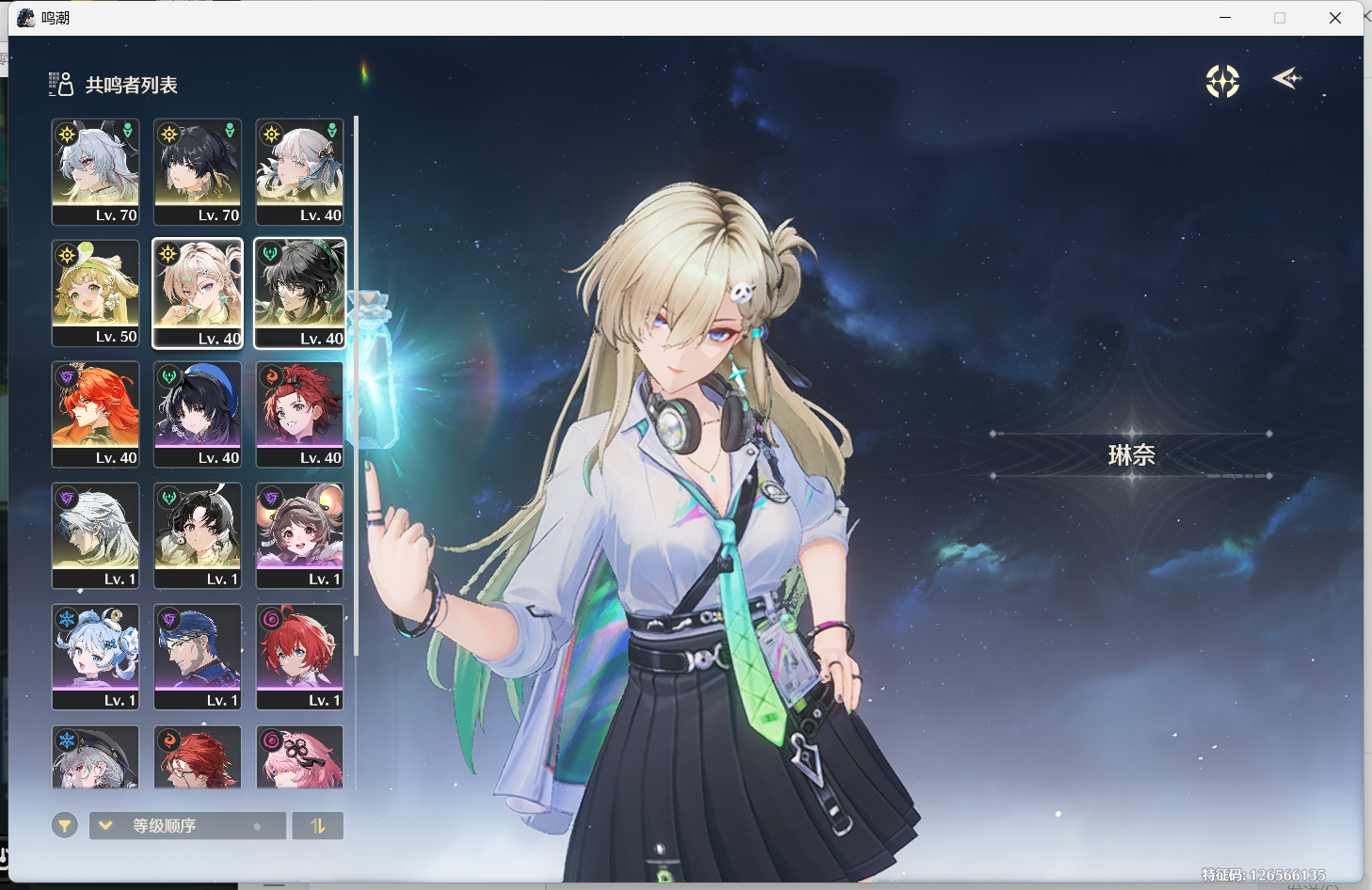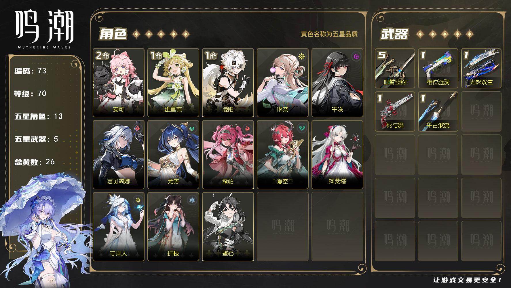 70级/26黄/男主/13个五星角色/5个五星武器未绑定,琳奈,千咲,嘉贝莉