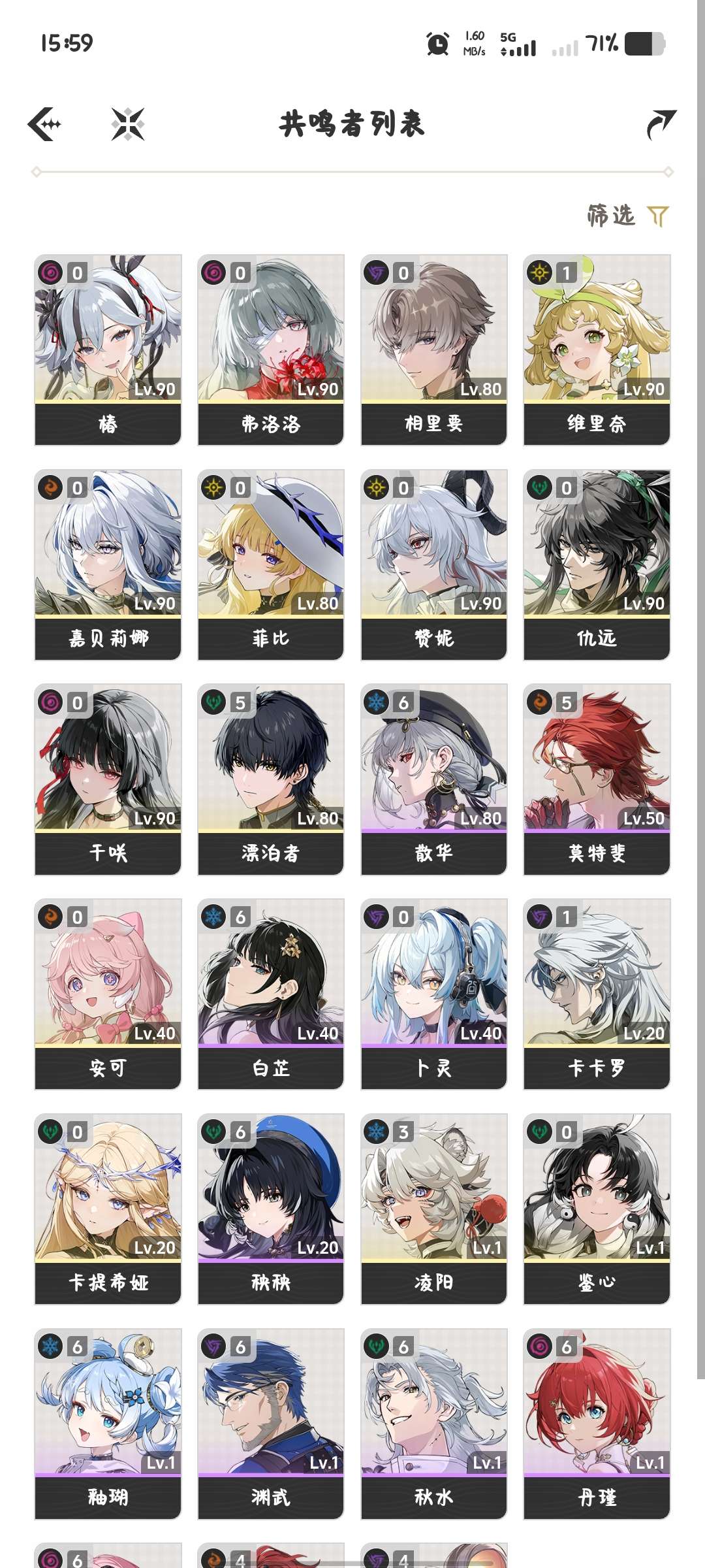 鸣潮5+1嘉贝莉娜,有弗洛洛,守岸人,号上还有51抽,14抽武器,活动门扉什么的都没动,无换绑cd