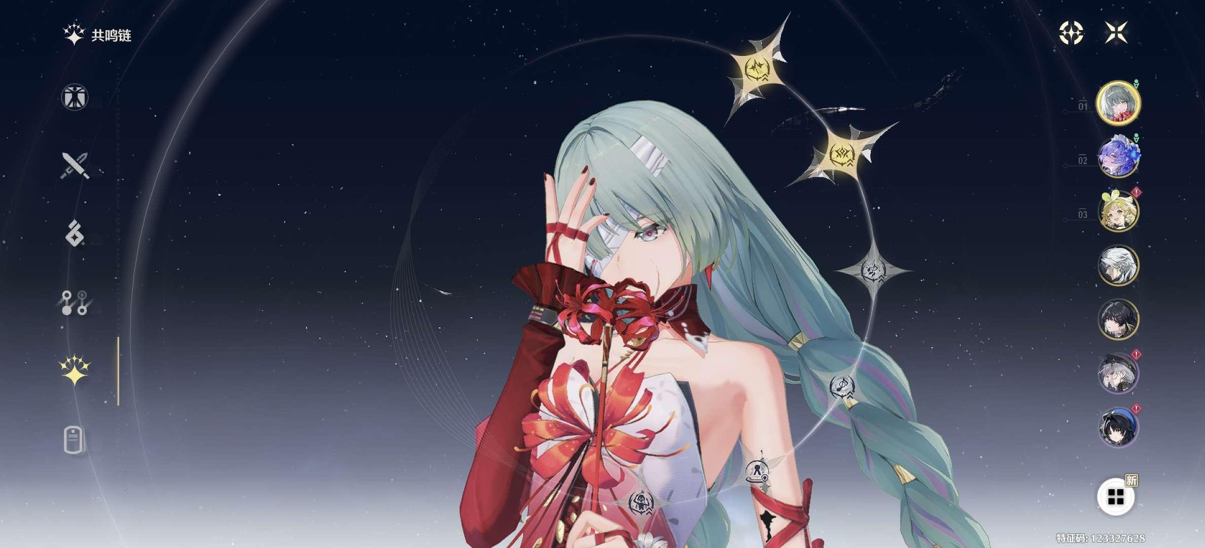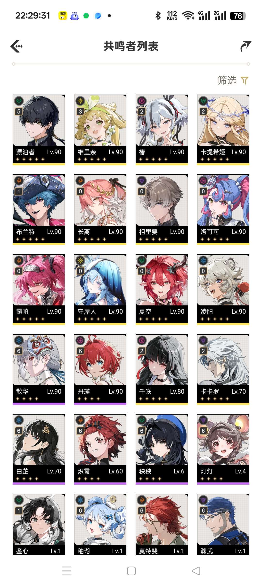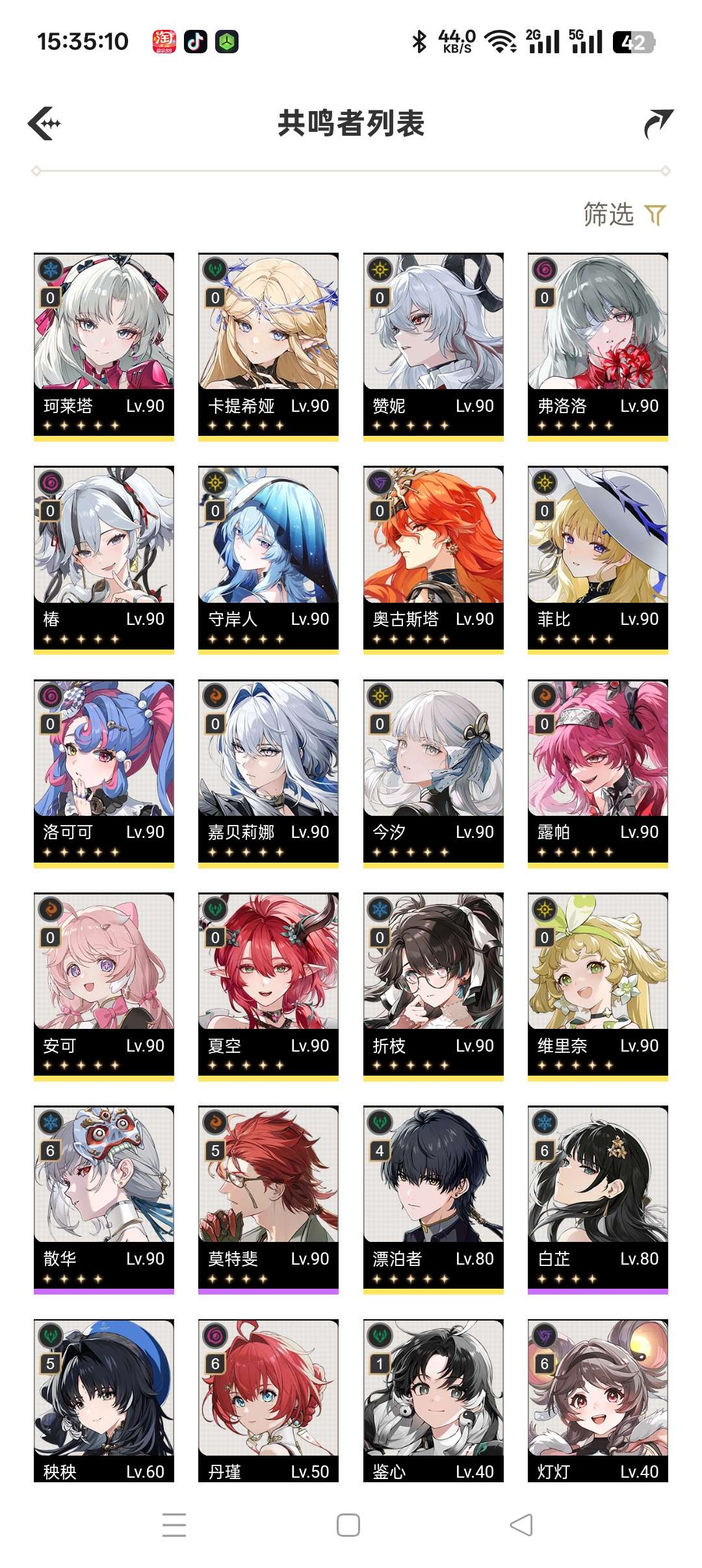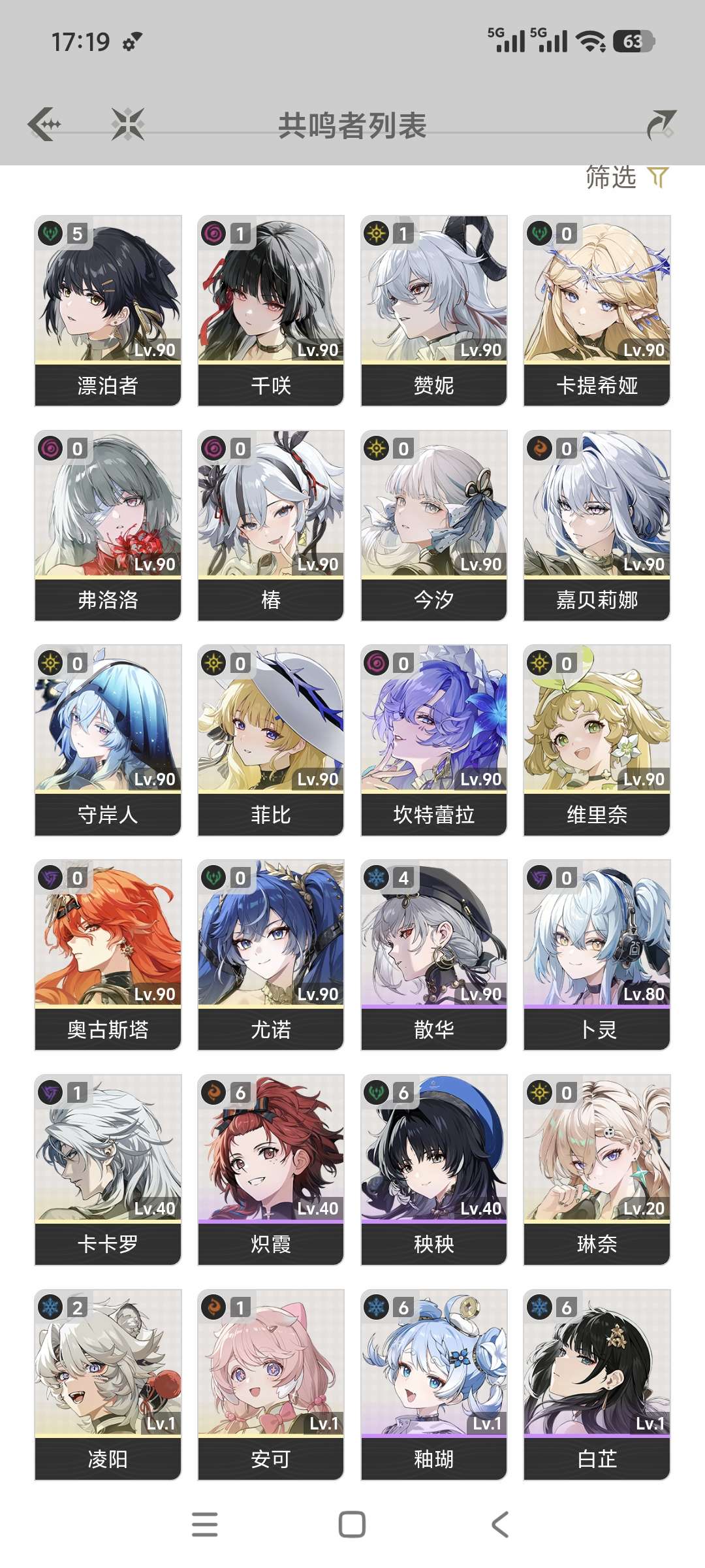 鸣潮21卡提21椿21千咲11船长,550珊瑚,都有专武,角色练度基本都毕业(长离有皮肤),很多任务