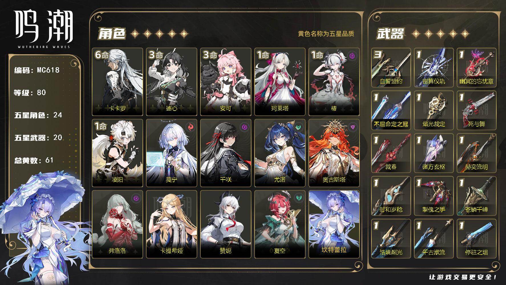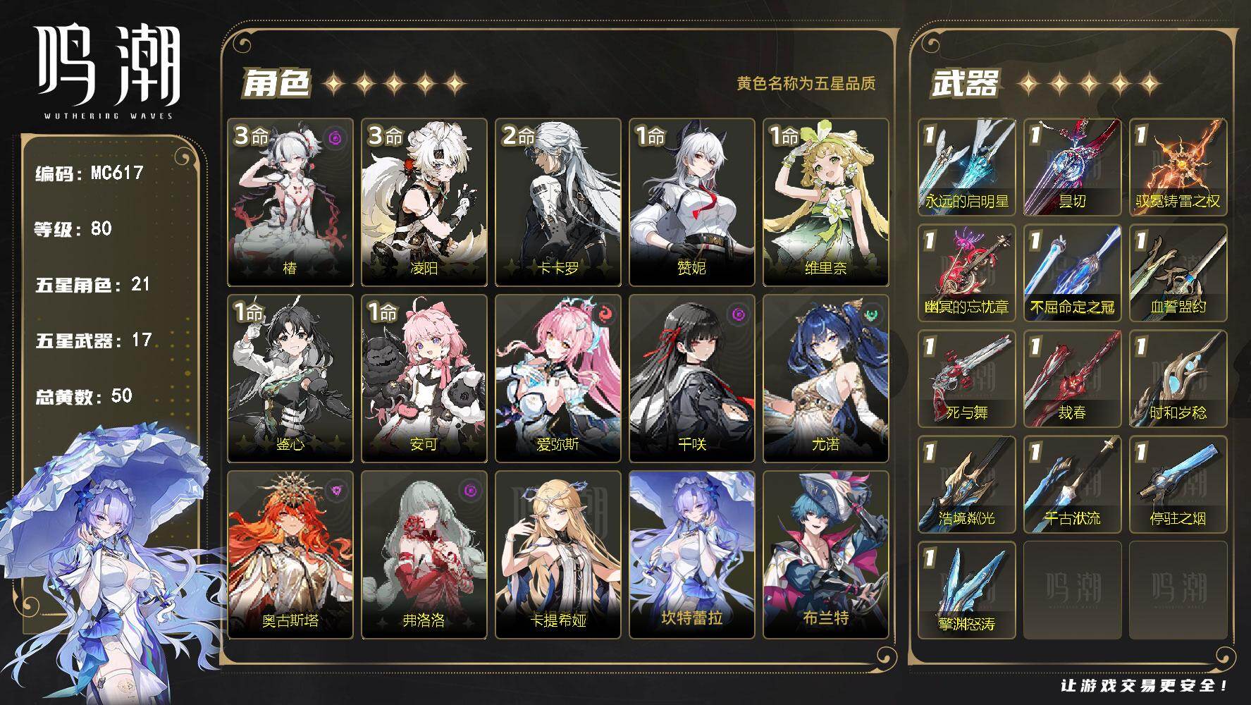 三链专武爱弥斯+守岸人+西格莉卡+三链维利奈,鸣潮号出啦!角色齐全,资源也很丰富,账号直接上手玩
