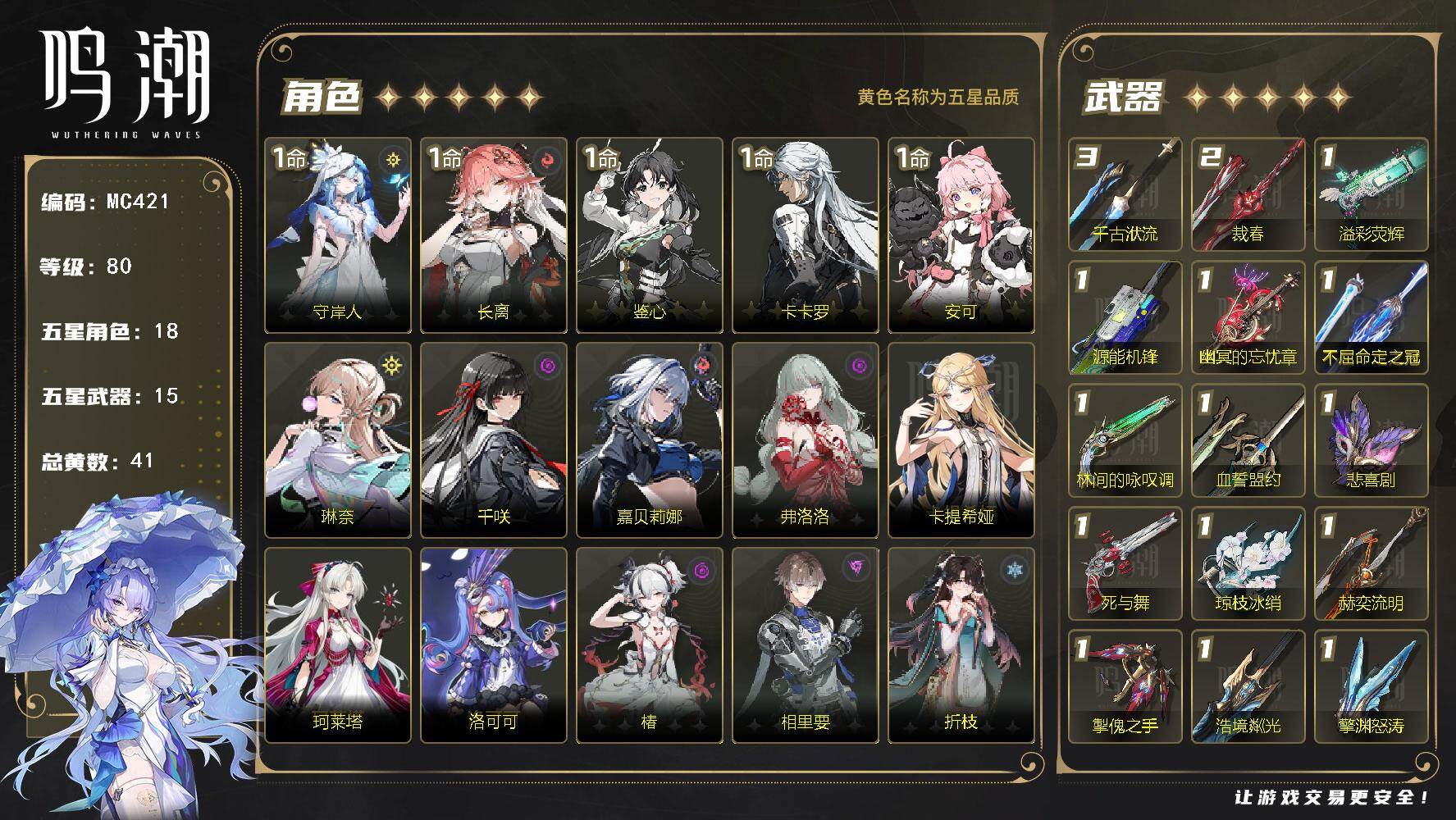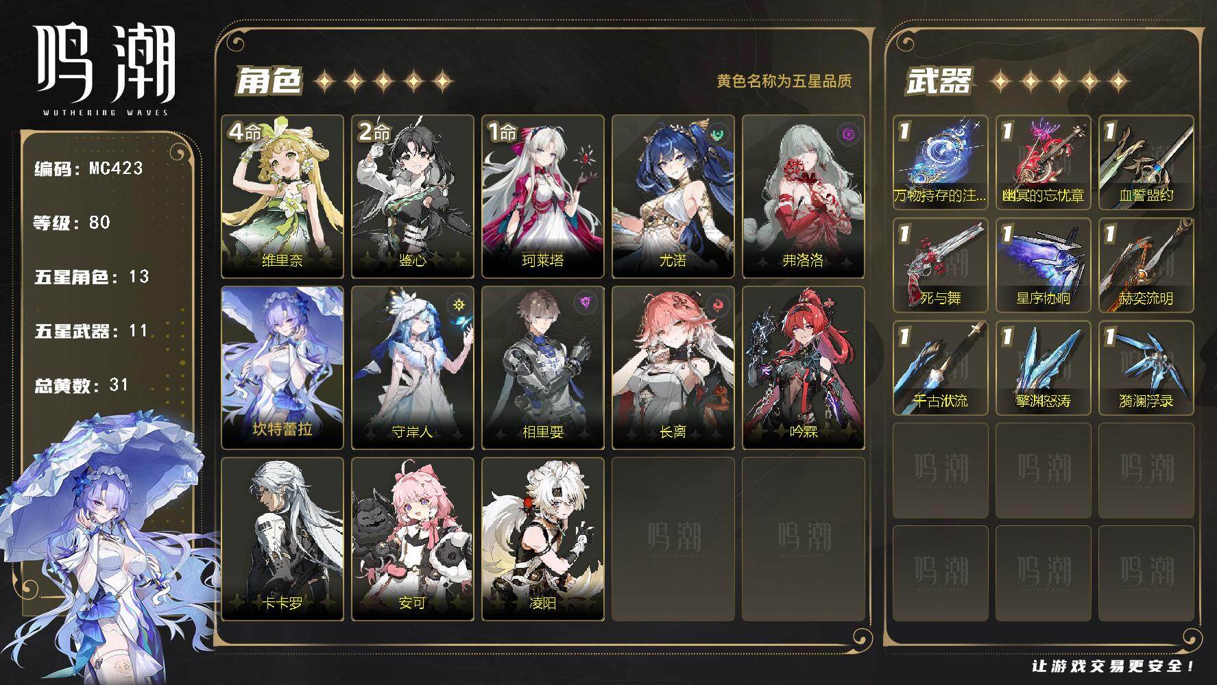 2+1椿,0+1爱弥斯,弗洛洛琳奈,一链维里奈安可鉴心,超欧十抽专武二十抽一限定,现有小月卡