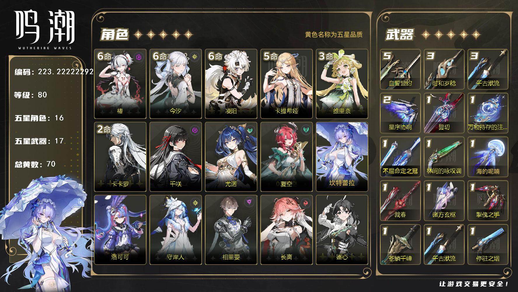 鸣潮,2+1卡提,2+1椿,2+1千咲,11船长,550珊瑚,都有专武,角色练度基本都毕业(长离有皮