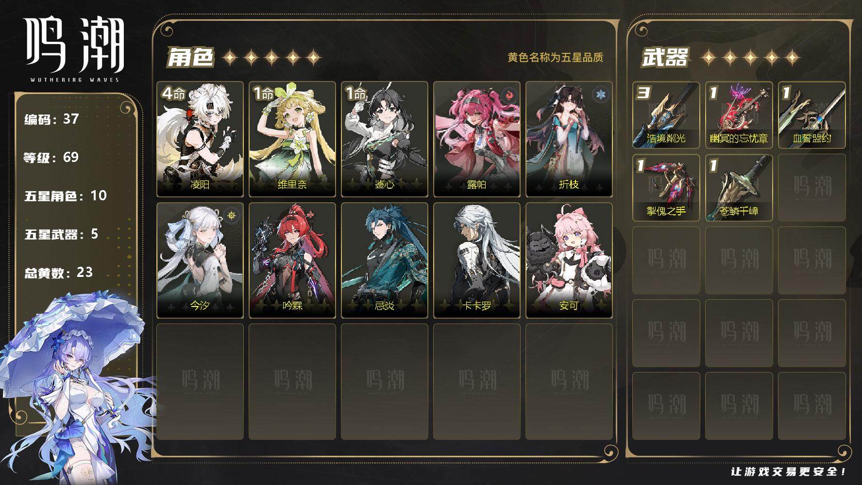 69级/23黄/女主/10个五星角色/5个五星武器 未绑定,露帕,折枝,今汐,