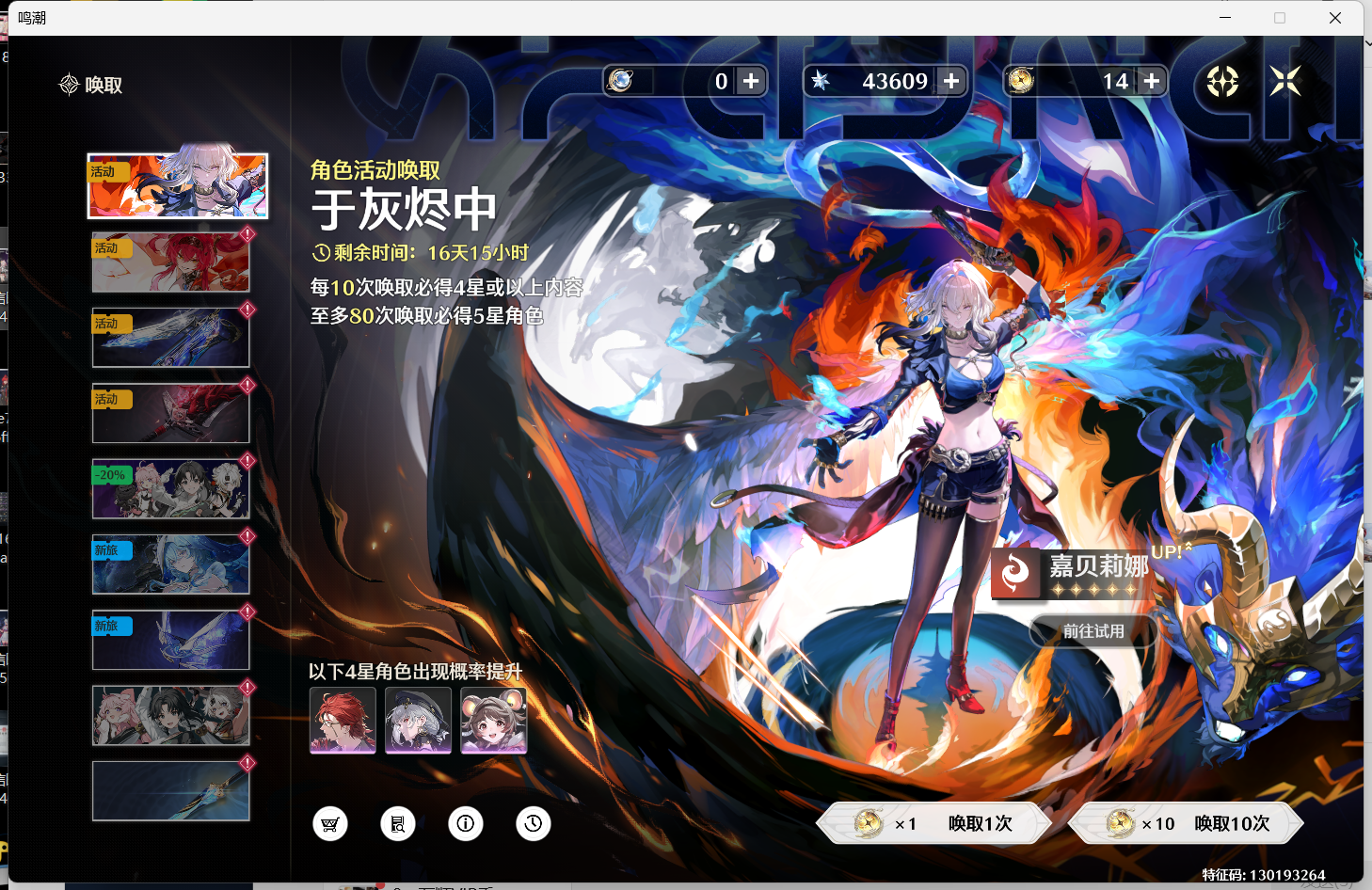 61忌炎 11今汐 2命安可 1命维里奈 0命卡卡罗 满命莫特斐散华 up池垫了40抽 常驻池60抽