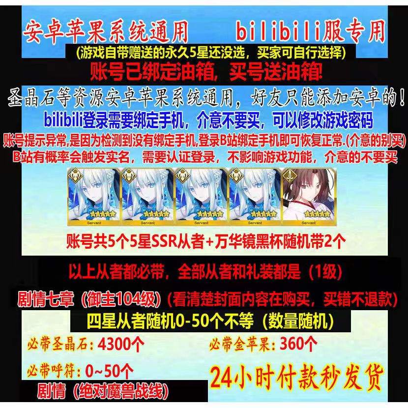 账号带4个5星SSR从者,3300圣晶石,270金苹果