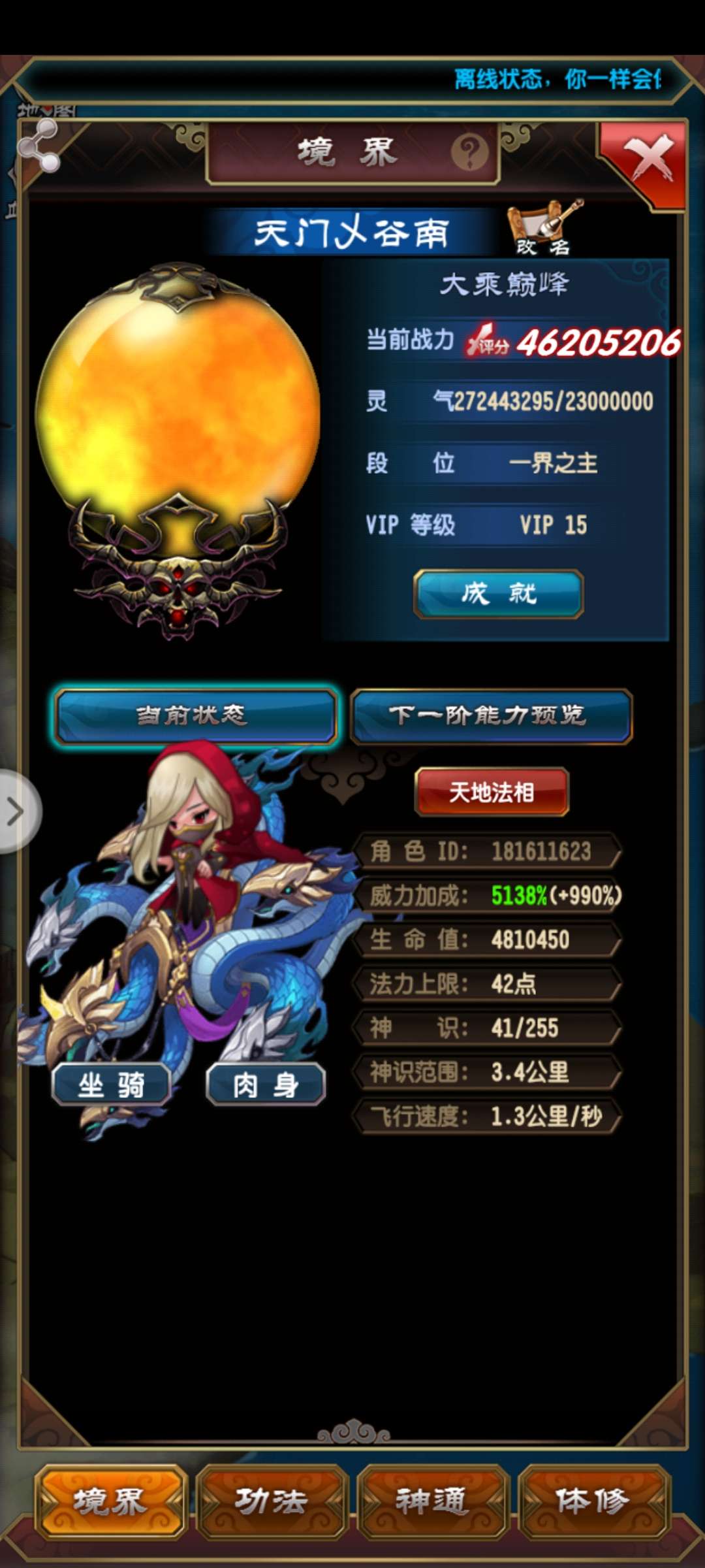 斗法第一,法宝全满。功法基本都有。战力4700万。资源多多