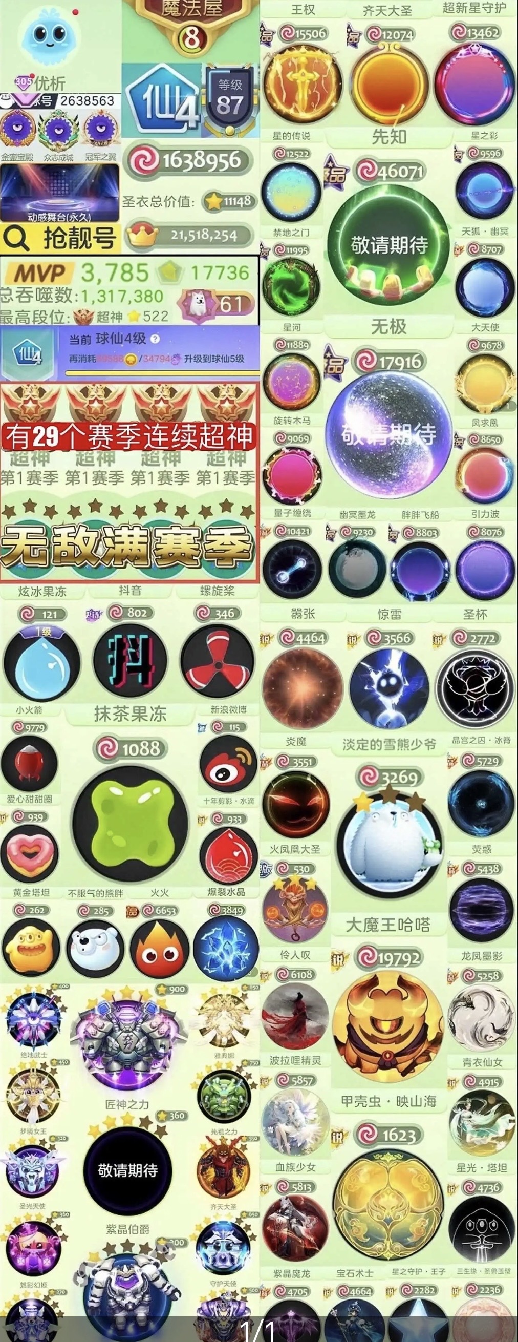 球球大作战帐号【准时空 破晓 阿芙娜 年卡 满级大圣 69吞噬】大闹天宫 先知 无极 二级魔星 大白