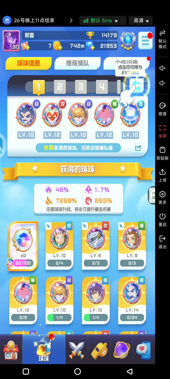 15-7个传说球球随机附带(李靖/魔力/脸谱/光棱/赤龙/骑士/乾坤/升星/无限/火球/复制/成长/)/5000-15000砖/球币