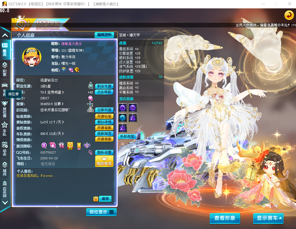 QQ飞车【端游】等级:150,魅力:8828,荣誉:75W+,紫钻贵族:Lv2;S赛车:众神之神;A赛车:七彩仙葫,