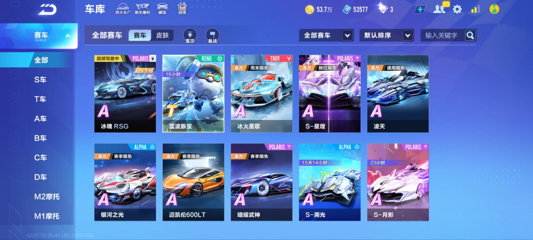 单联赛霆光A车数量15游戏等级68贵族等级6车皮肤数量6安卓