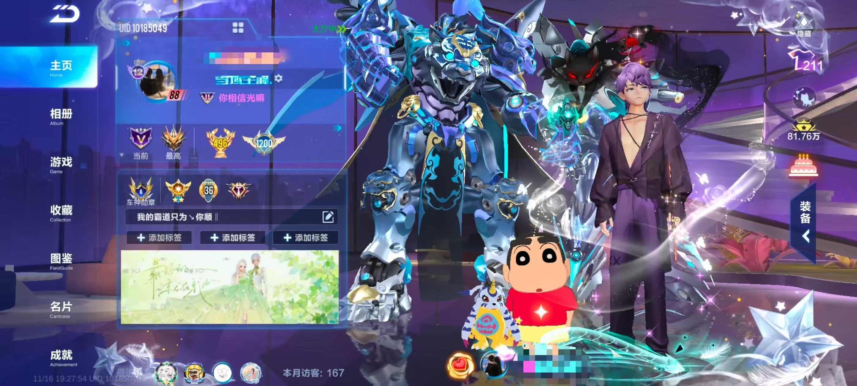 等级76,3T机甲,熊猫宠物,段位:绝影星耀V,魅力值:18.85W,,贵族等级:V11