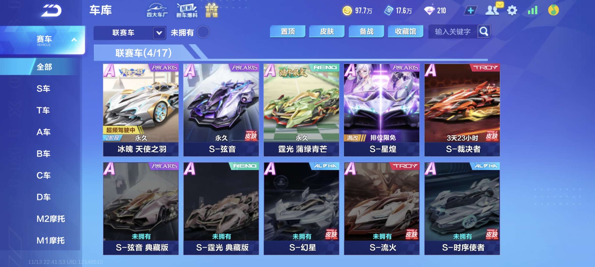 [4联赛车]有溯光,有弦音+千面雾使,霆光+神虎,冰魄+天使皮+火神,还有420金晶,还有788钻