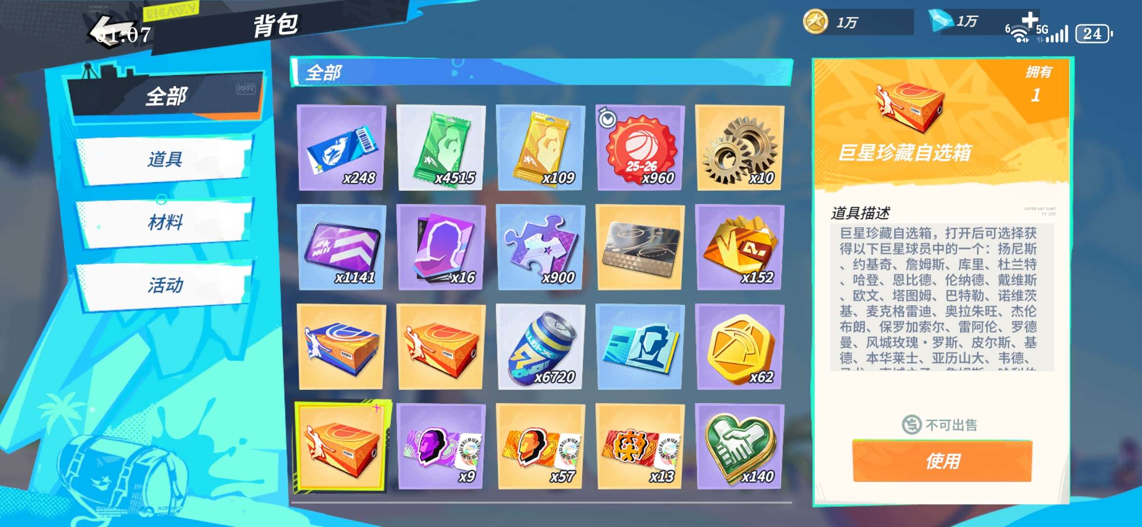 资源号,2自选箱,1万钻石,57巨星券,154巨星天赋,满突洛佩兹,2突布克