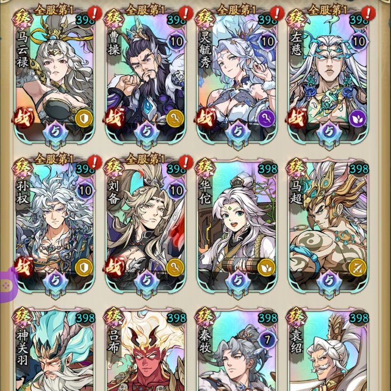 V20灵10曹操,灵6司幼幽,魂赵云5星极道5星弑刃,5星御敌满星相柳。3星熊猫