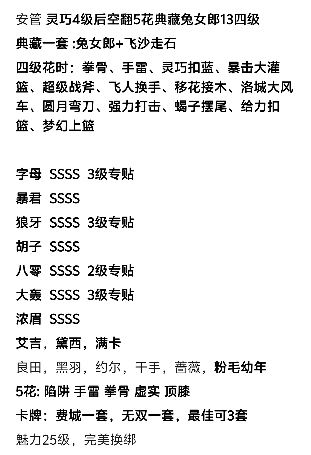 两套兔女郎6花,灵巧扣,4级灵巧上篮 5快投花