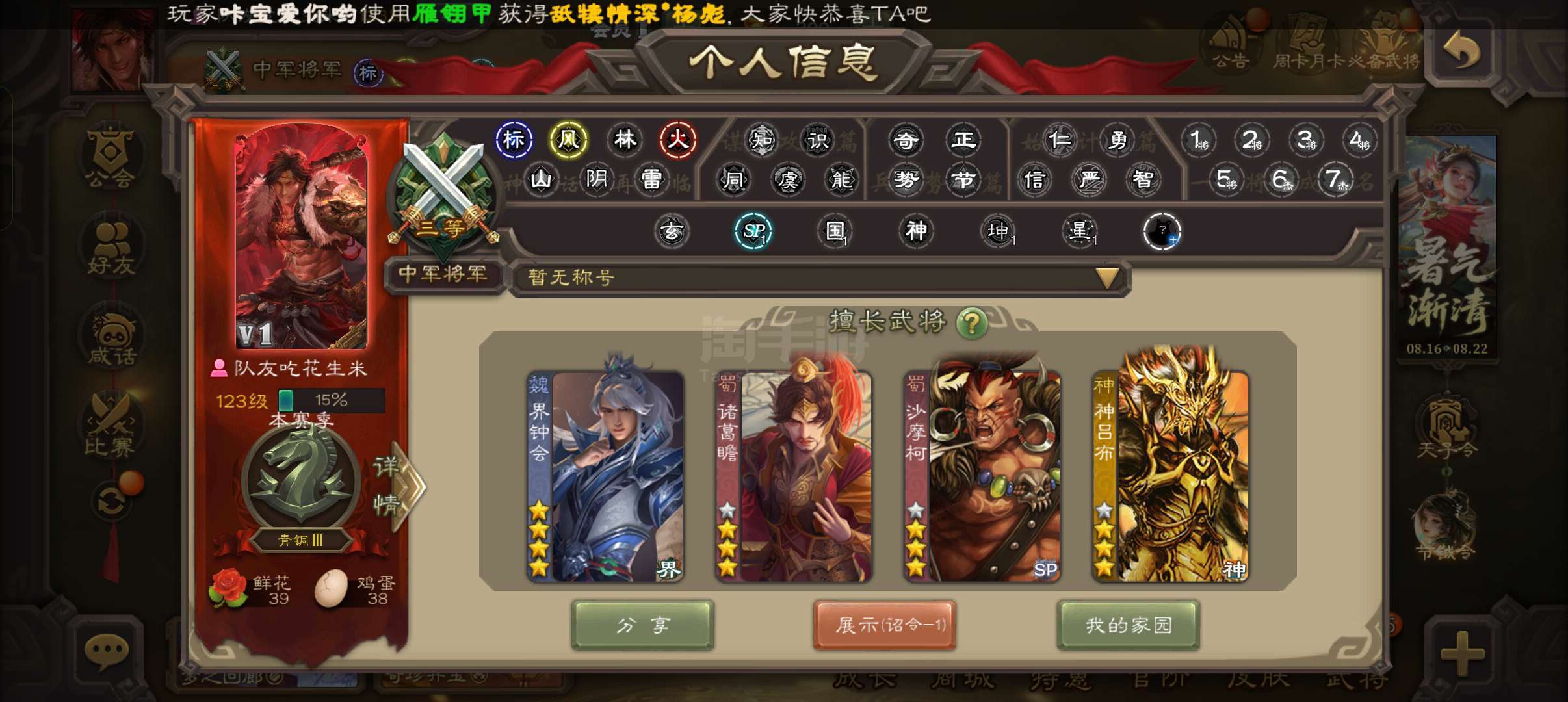 8万3羽毛,界李儒星黄忠神吕布公孙康谋赵云谯周左慈7史诗二等先锋,天工吴柯神吕蒙势陈到界孙权158将