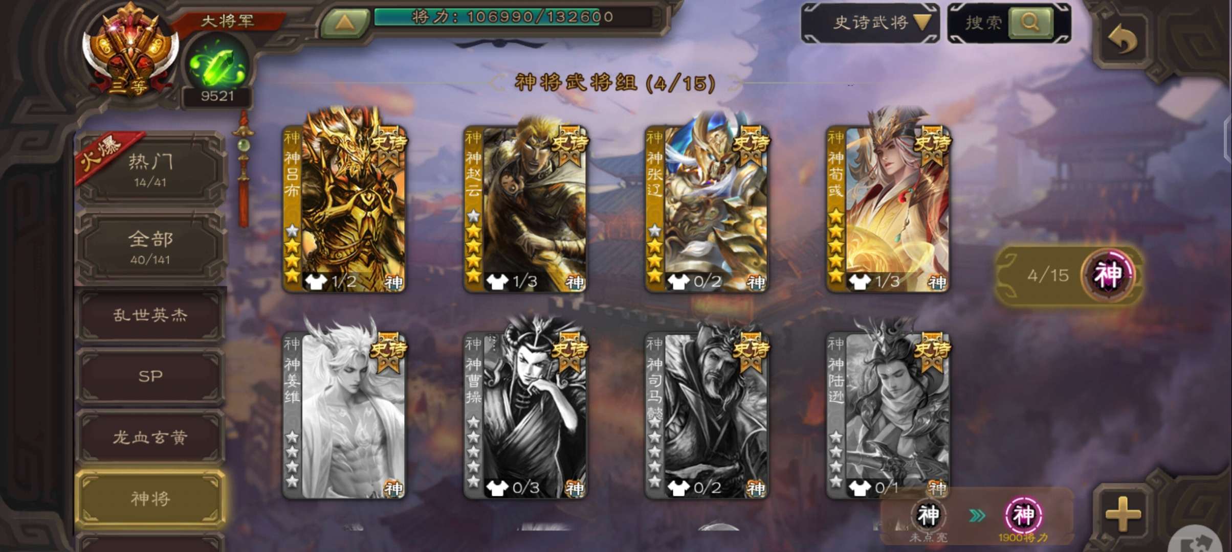 7.9万羽毛7万豆,友诸葛亮神赵云神吕布戏志才界钟会界于禁牵招10史诗中军,谋周瑜界满宠170将