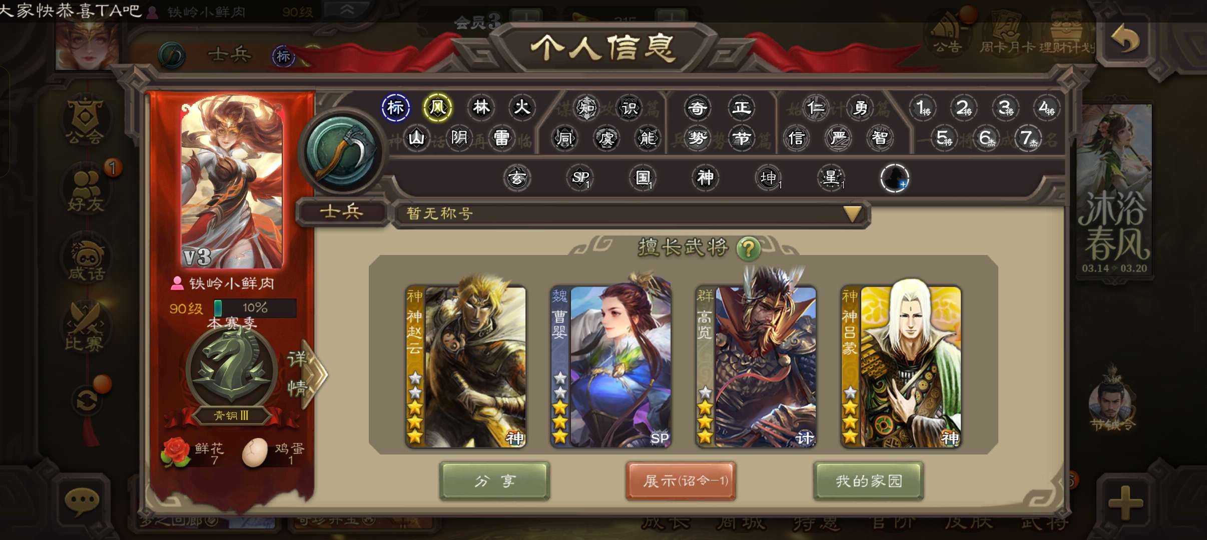 39.3宝珠9万羽毛5400魂,神赵云曹婴界黄忠3史诗先锋,神吕蒙动态关银屏谋卢植谋高顺谋韩当霍峻