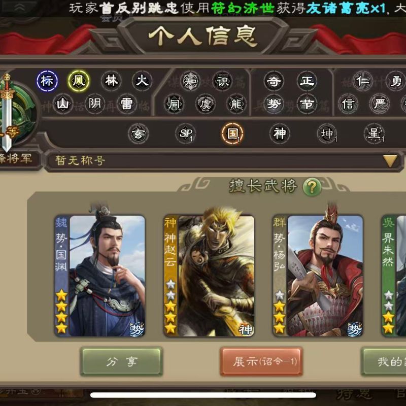 三史诗校尉排位强力小号,孙权荀彧关索武将动皮都有,5.9宝珠,也有大师奖励势夏侯,乐就