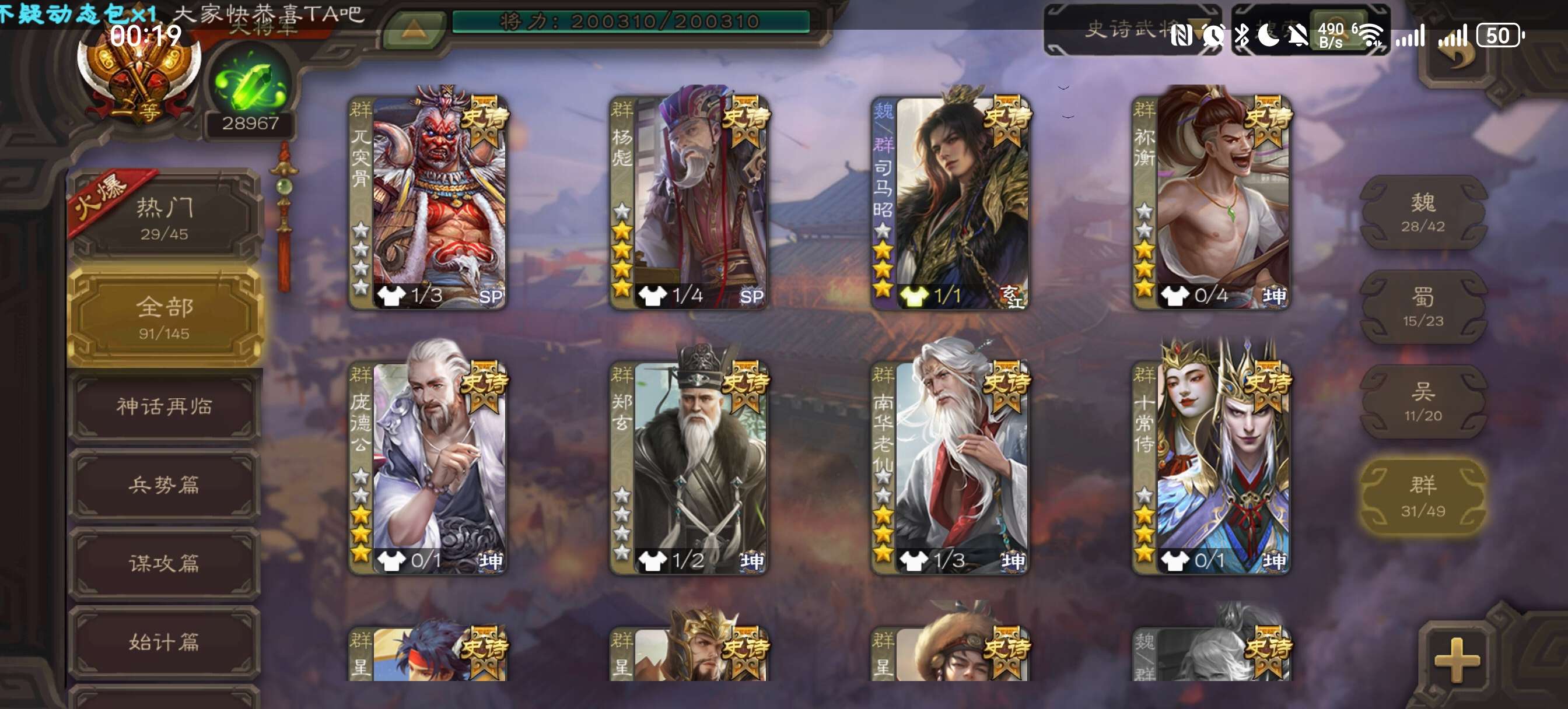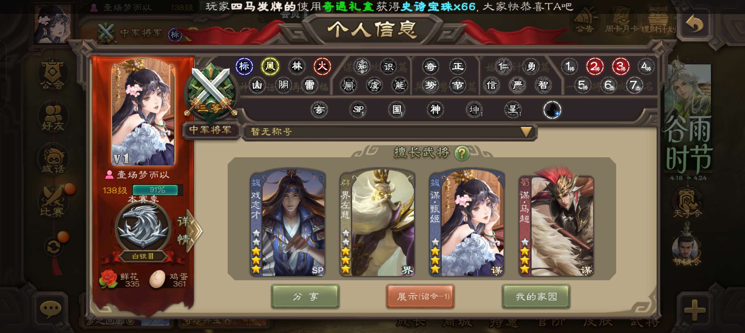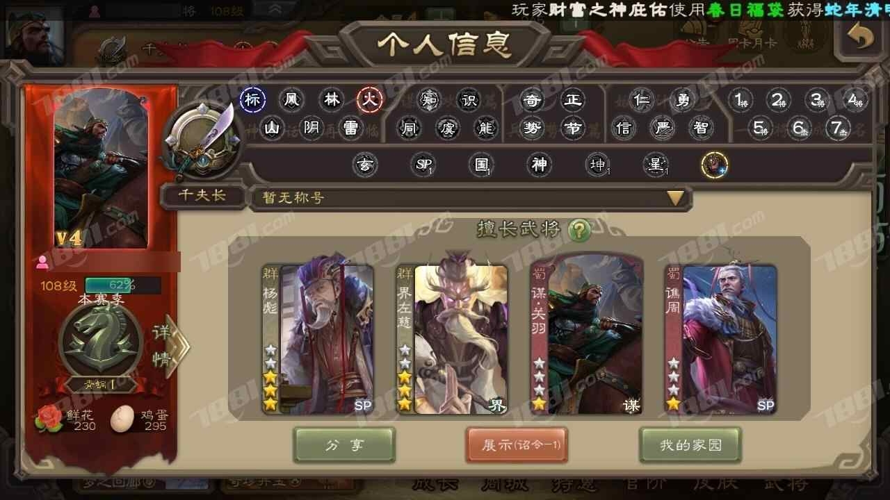 7史诗先锋,10万羽毛4千将魂6万豆,界钟会沙摩柯神刘备郝昭张星彩董允左慈,羊钴谋韩当156将