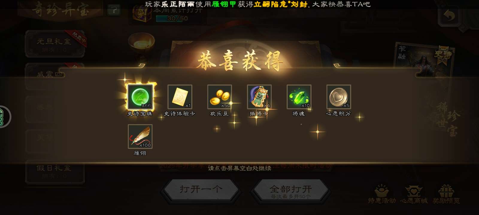 随机3~5史诗账号内最少三个史诗包含一个谋将随机带含新版武将有几率大将军刘焉等旧强力武将