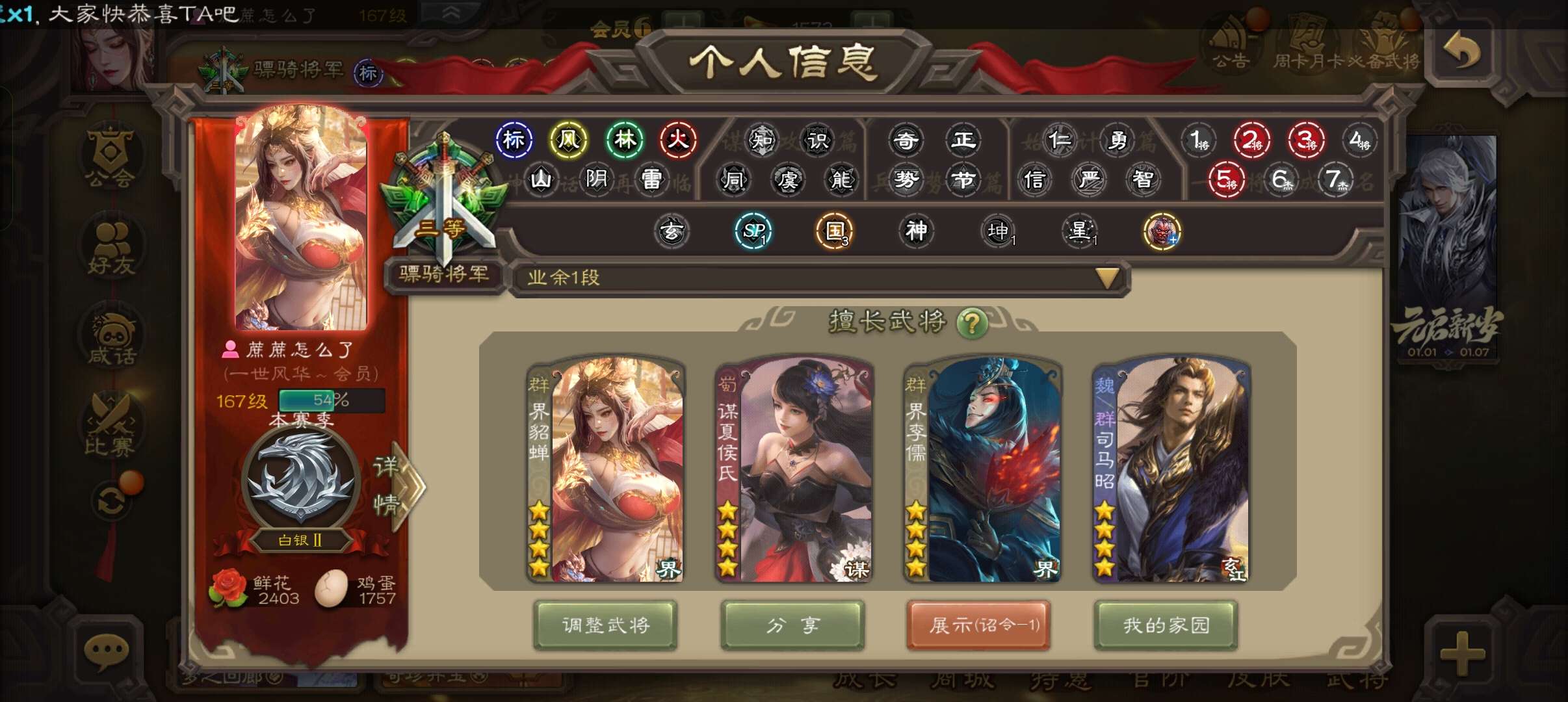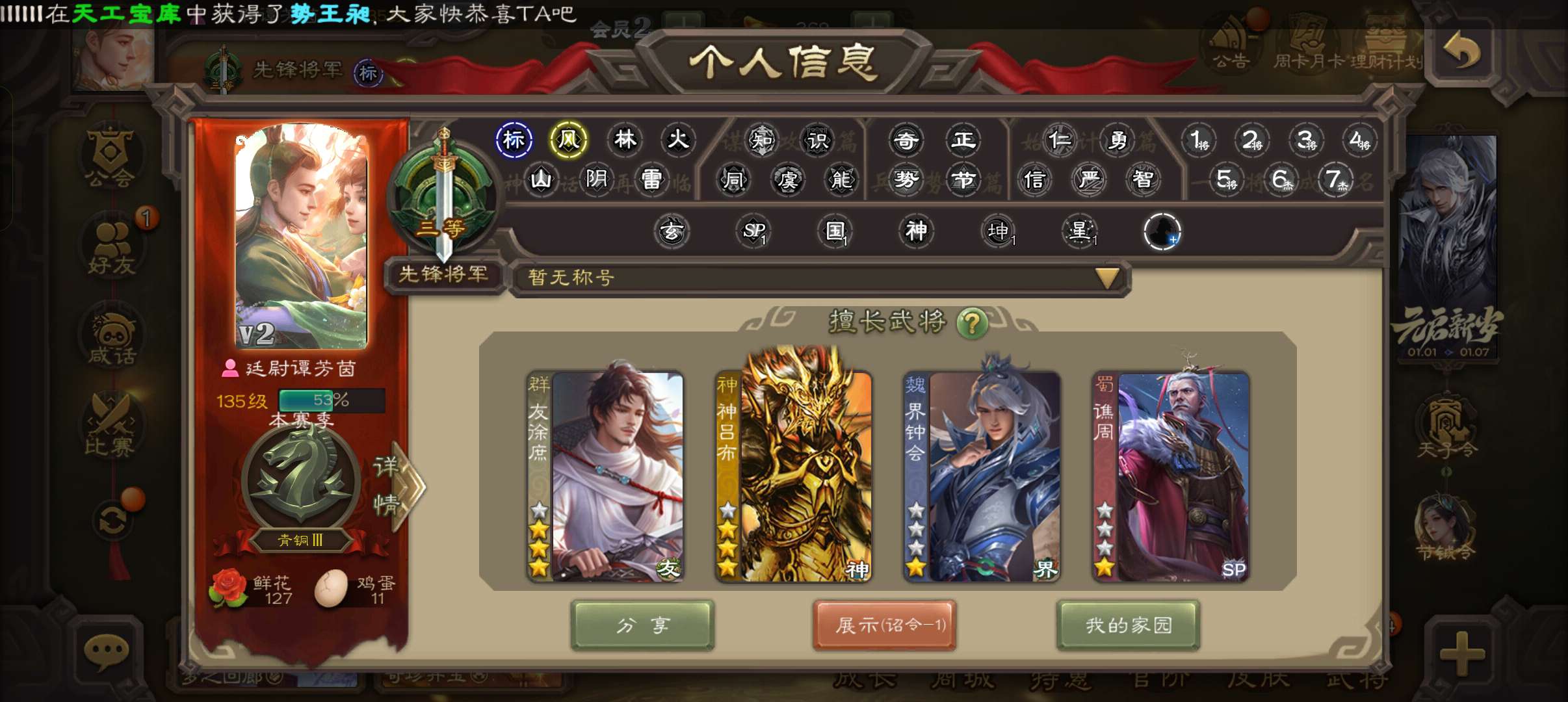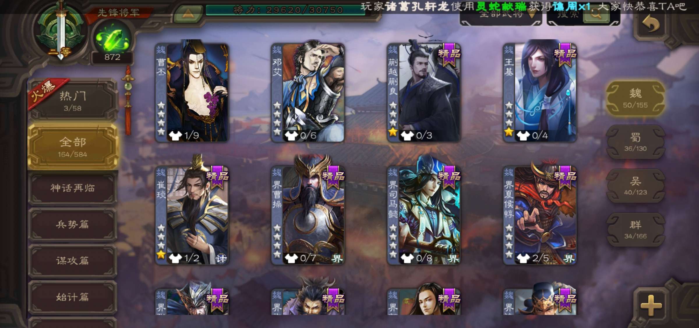 3史诗双天工材料先锋,9万羽毛7150魂7万豆,友徐庶谋孟获,界钟会神吕布谯周,甘夫人关银屏134将