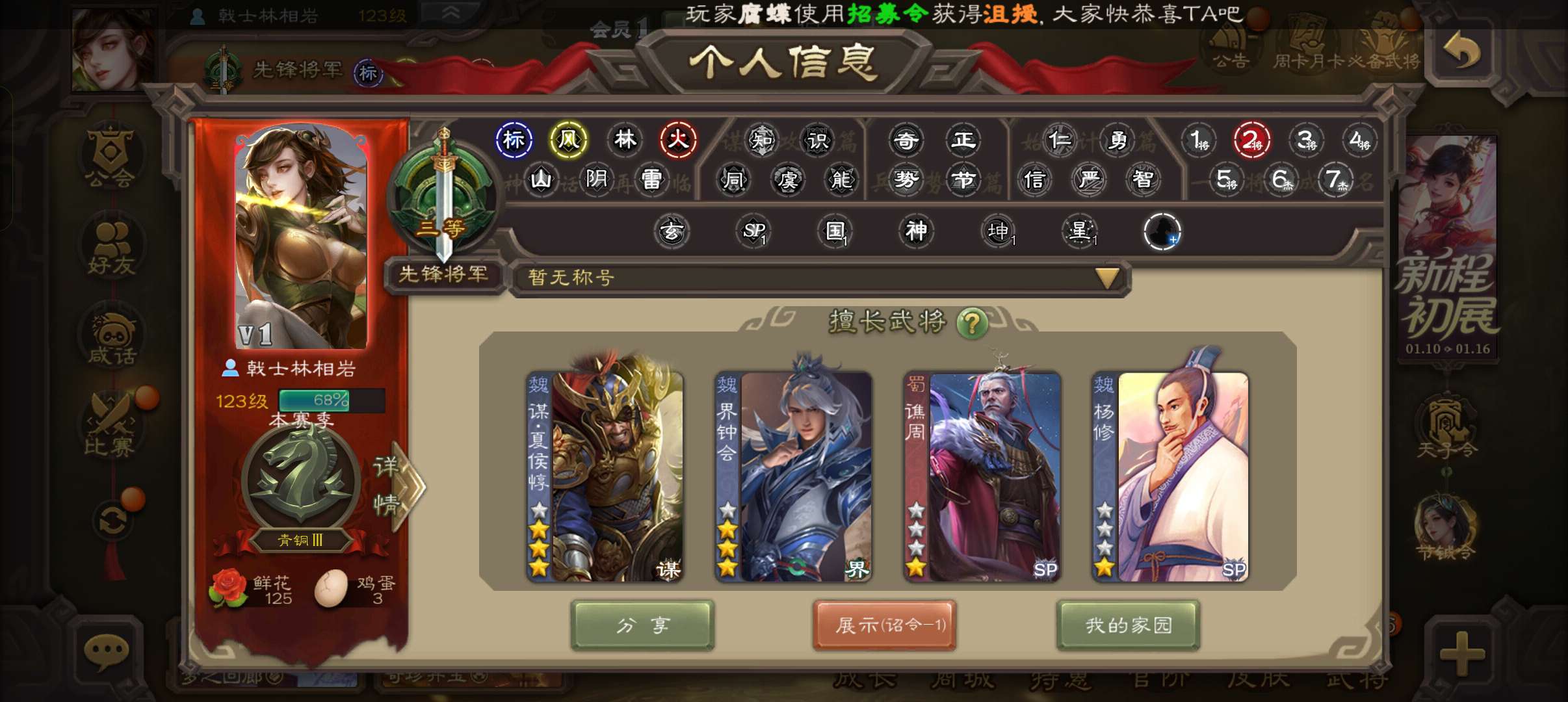 先锋将军,回廊动态张星彩沙摩柯界朱然3史诗,谋高顺崔琰张布130将,3.6万豆