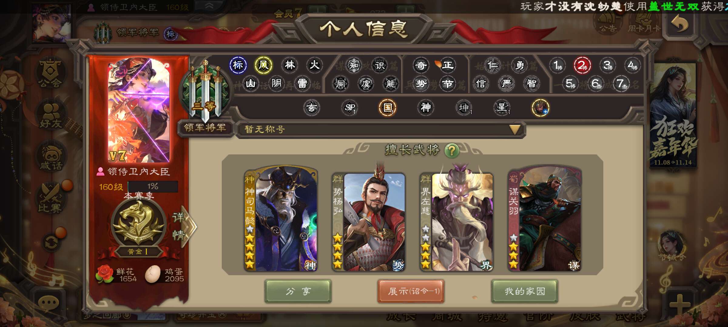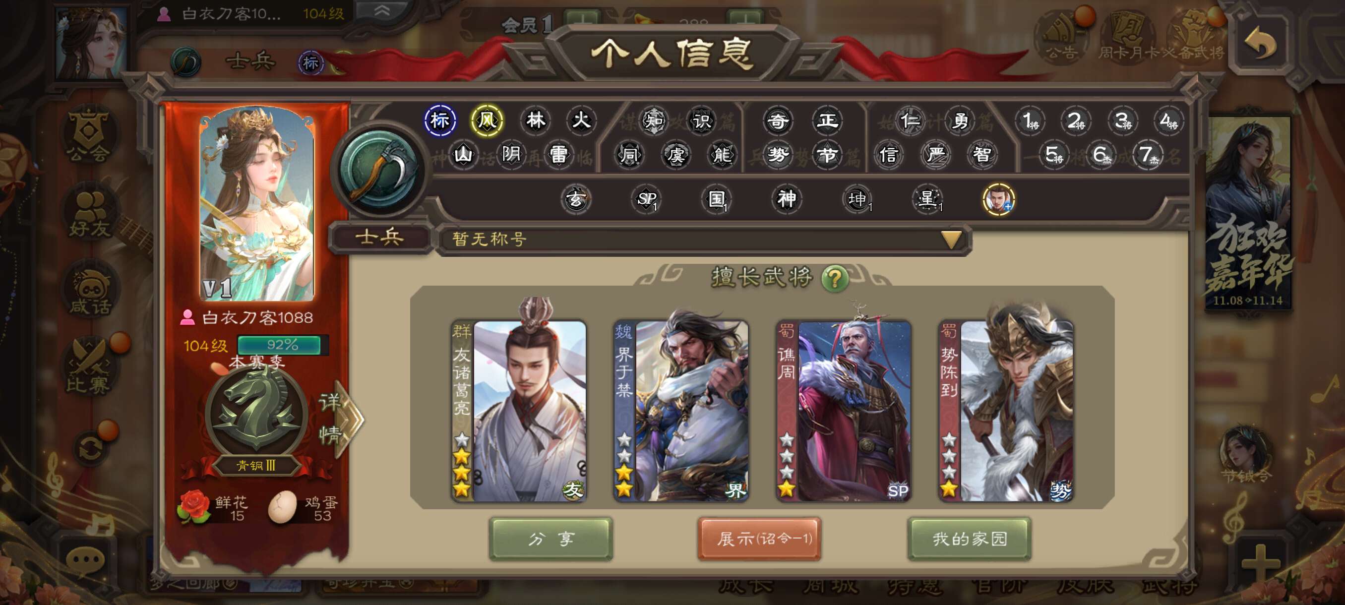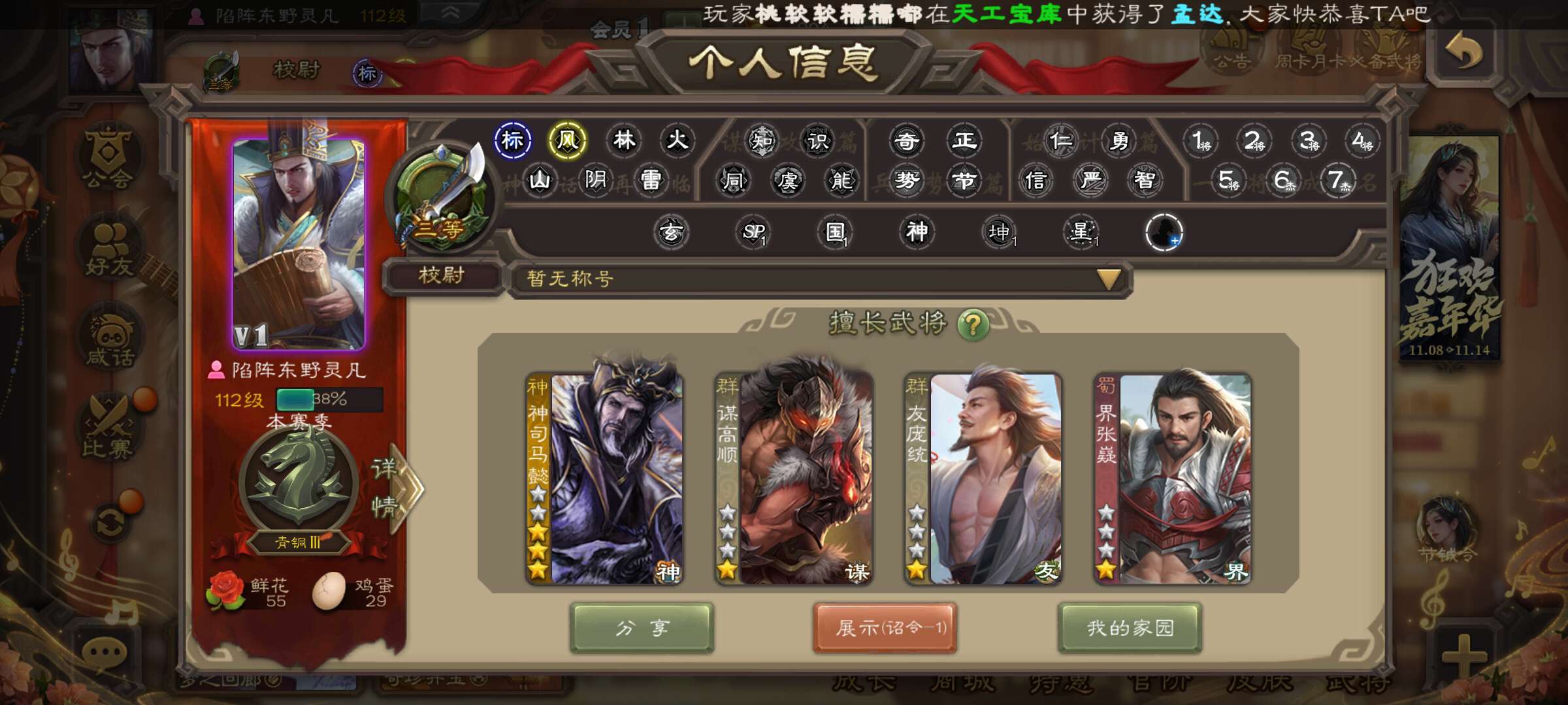 三国杀【安卓官方】友诸葛亮+界于禁+谯周超级士兵开局号!总将61,材料充足,游卡官服字母格式活绑