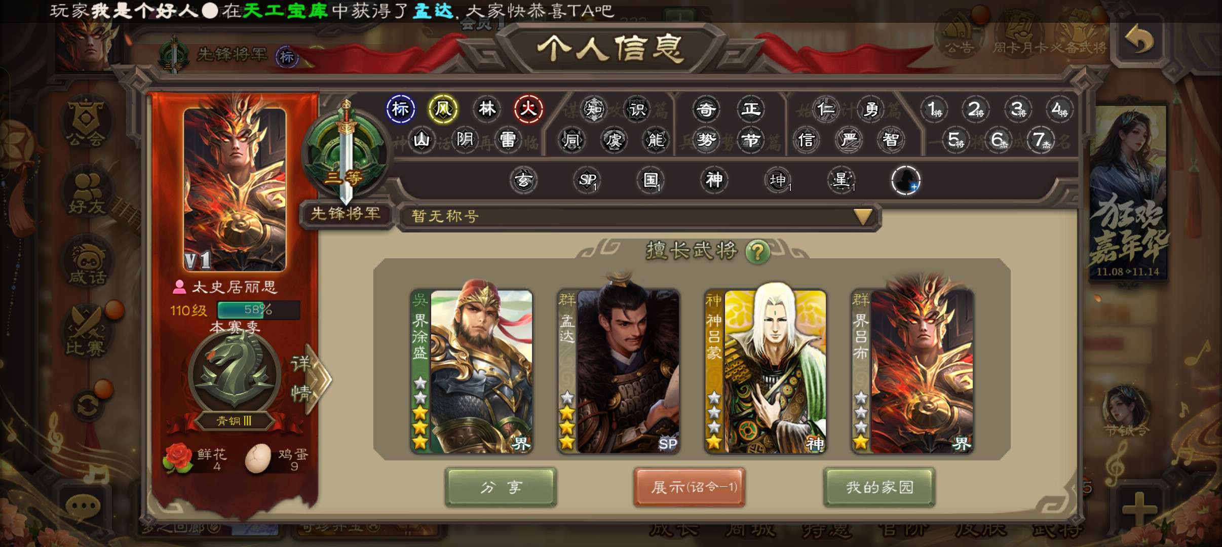 三国杀【安卓官方】先锋将军,1万将魂7.66万羽毛,天工孟达,大宝界徐盛神吕蒙金皮界吕布谋韩当崔琰145将