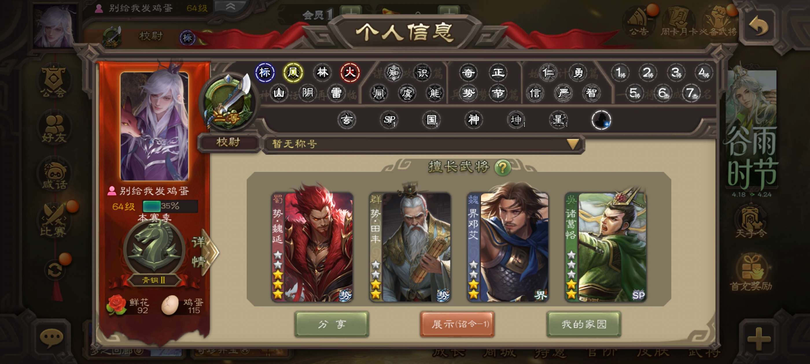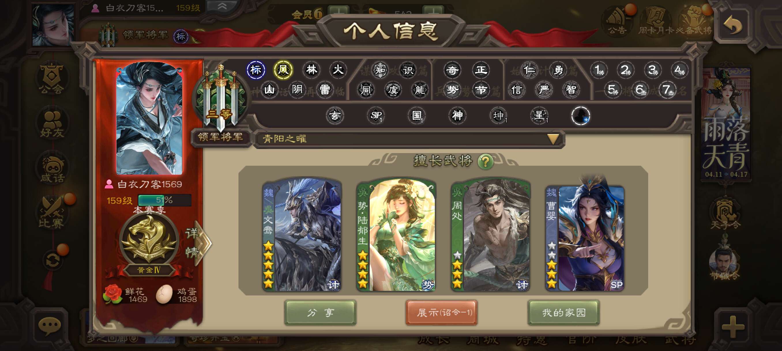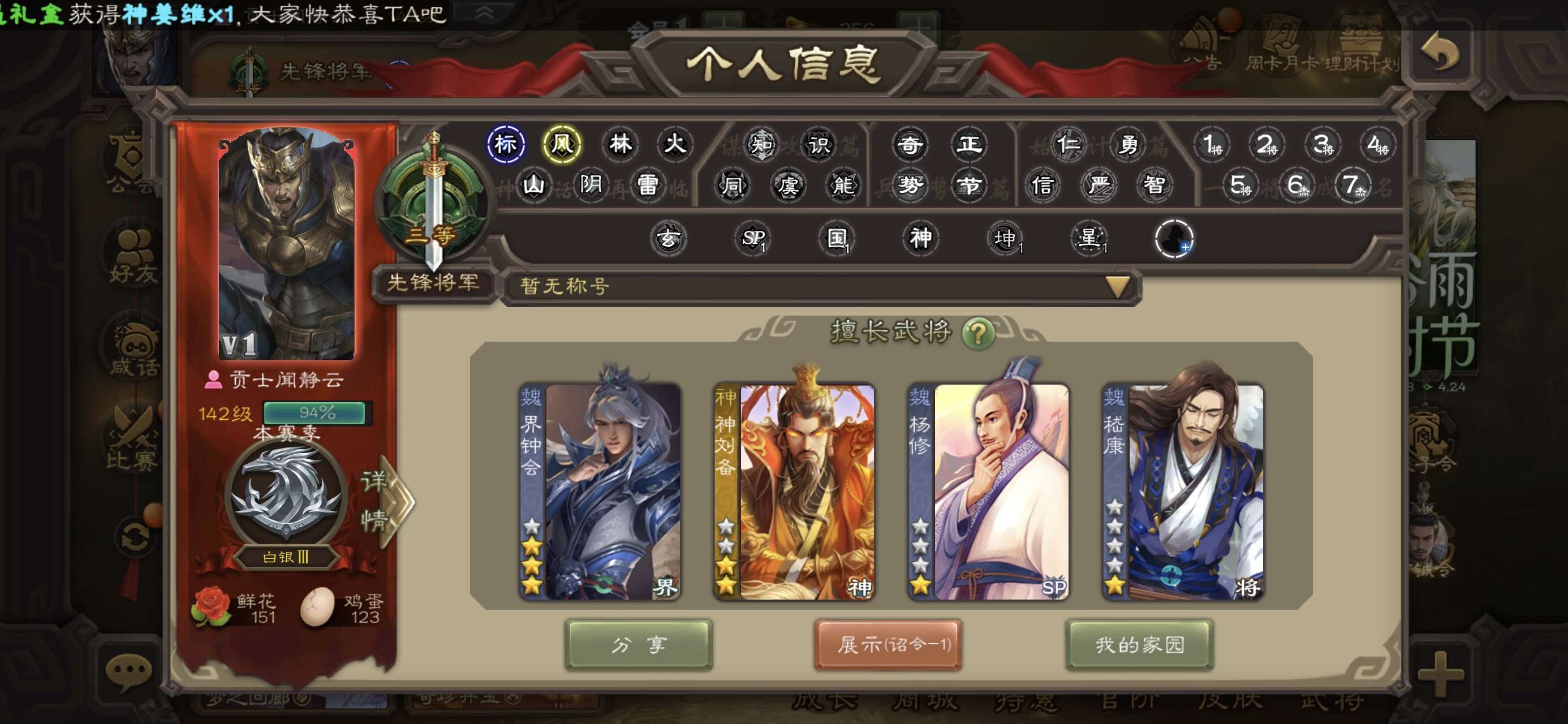 6史诗先锋,6.9万羽毛2200魂,神司马懿神刘备董允张星彩杨修左慈,势陈到甘夫人关银屏152将