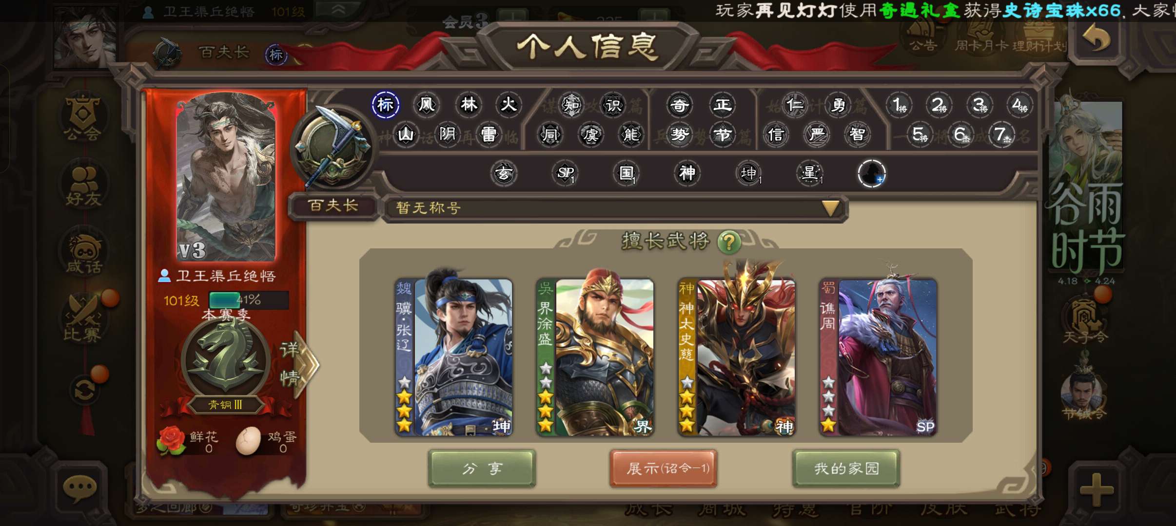 8史诗超级百夫长,11万羽毛8500魂9万豆,骥张辽大宝神太史慈花鬘谯周张星彩董允审配,225招募令