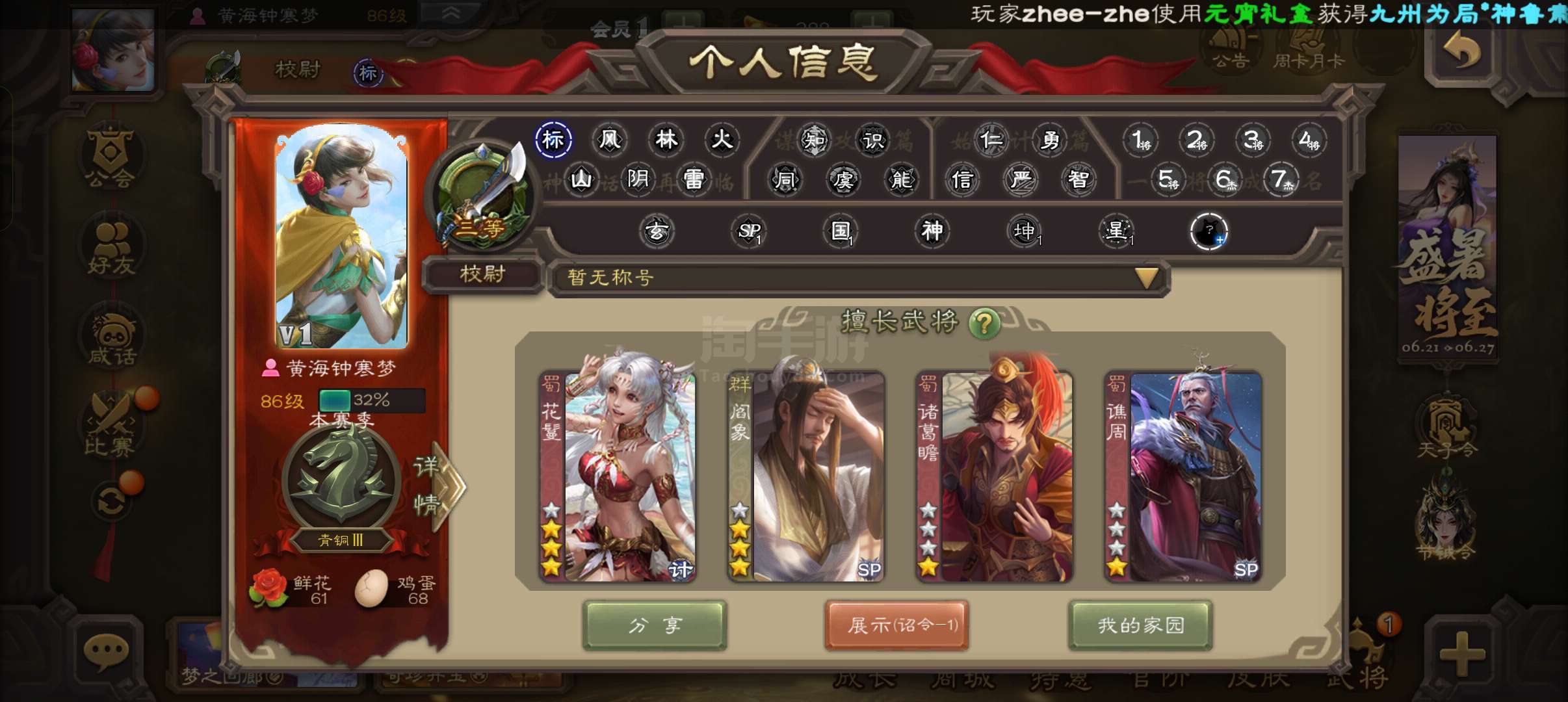 7史诗3神先锋,4万毛,庞德公戏志才神刘备谯周花鬘嵇康左慈,神周瑜神吕蒙sp赵云谋卢植谋小乔145将