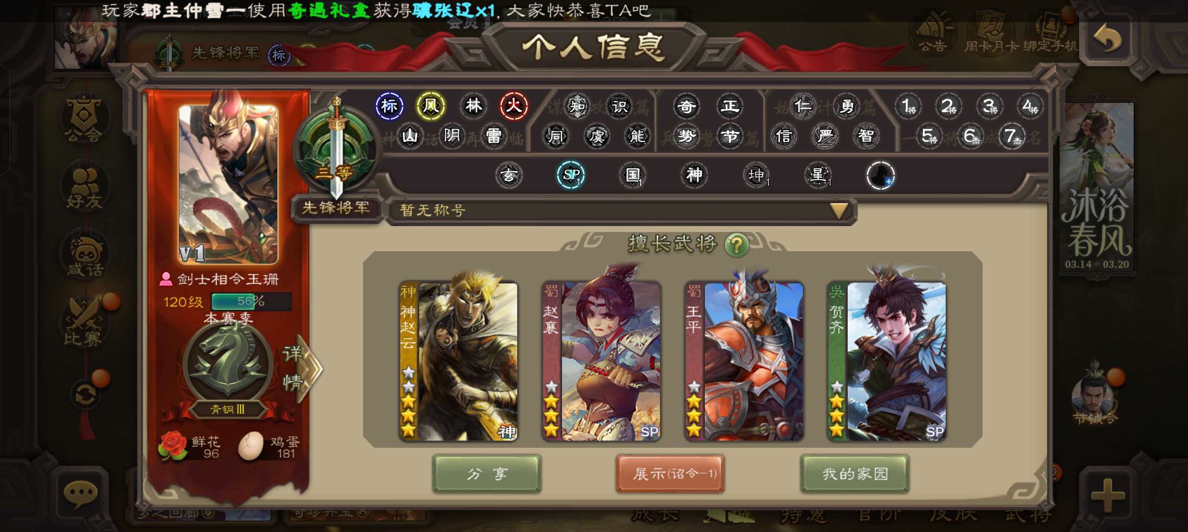 5史诗先锋,8万羽毛4万豆,神赵云界黄忠赵襄马云騄左慈5史诗,神吕蒙谋小乔桥公界曹植彭恙132将