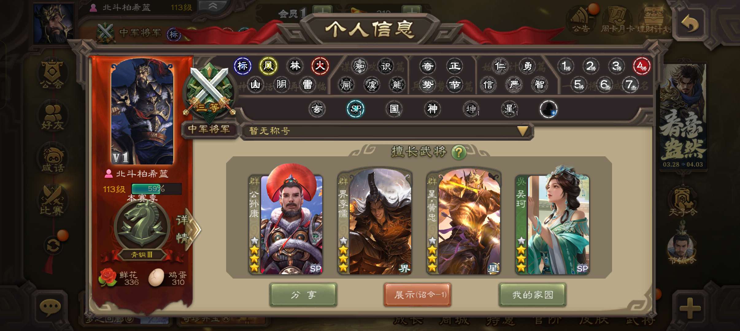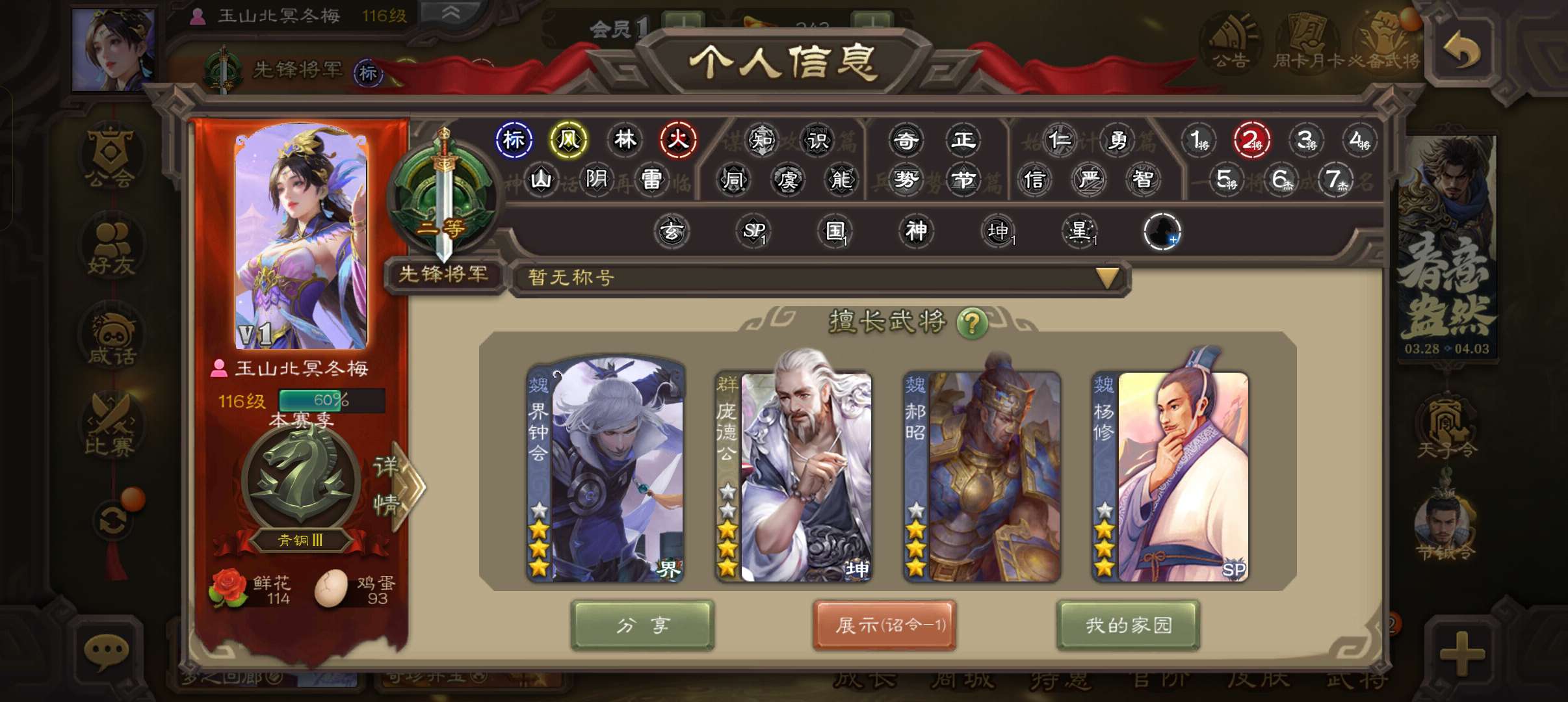 5史诗双神先锋,5万豆4.2万羽毛,天工玄母丘倹,界钟会谯周嵇康杨修左慈,神周瑜神吕蒙谋韩当148将