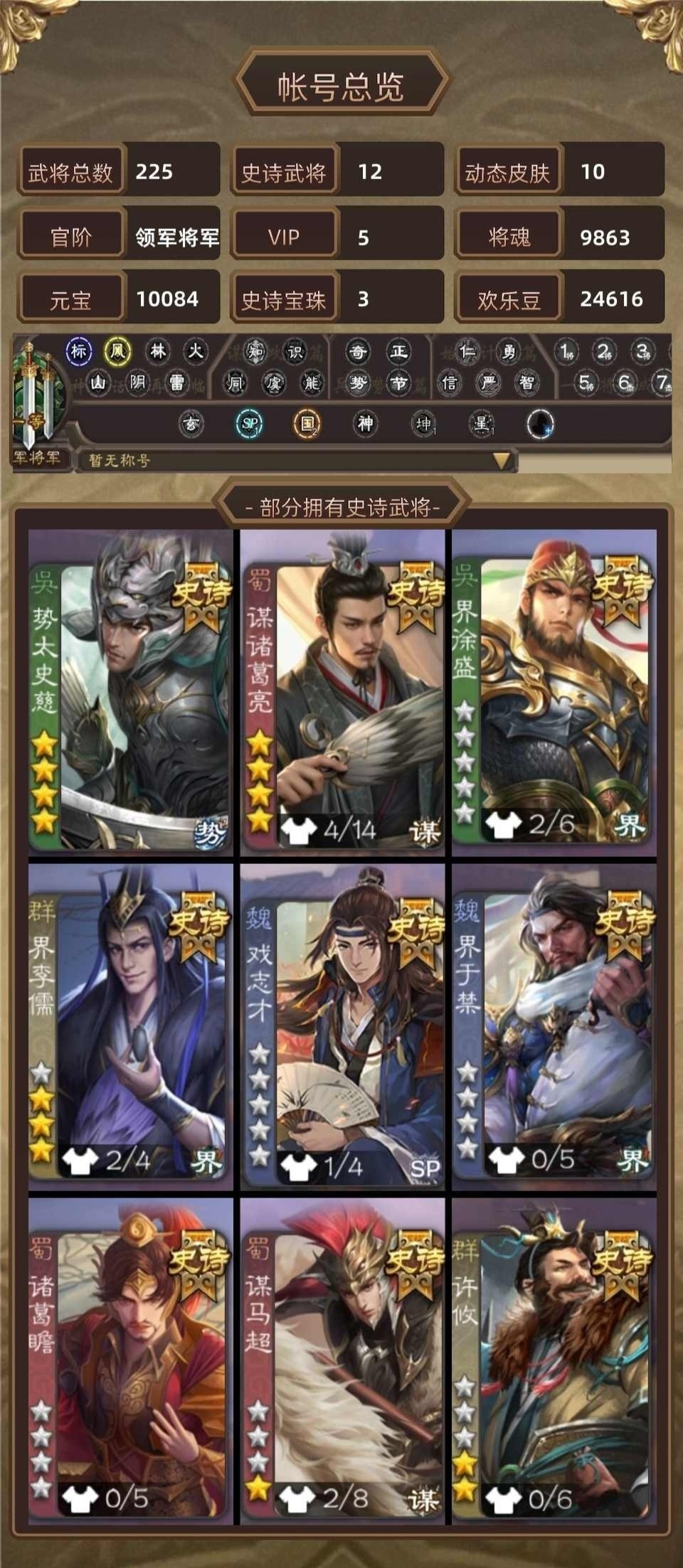 大宝➕界钟会➕骆统➕神吕布➕界曹真➕程昱➕谋马超➕卑弥呼➕戏子/9史诗中军官服活绑靓号