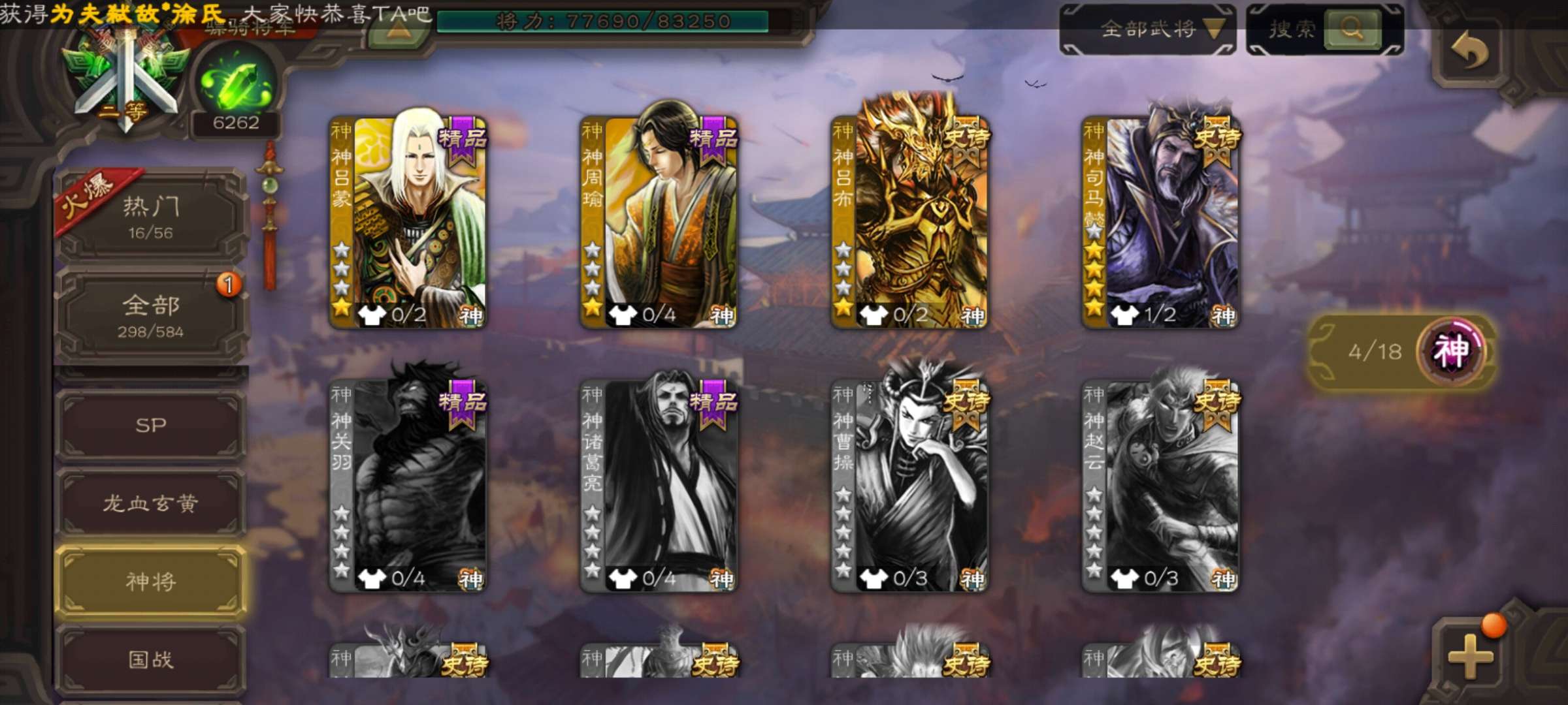 4史诗超级兵,3千魂6万羽毛5万豆,沙摩柯花鬘王粲马云騄,谋高顺张翼75将,88招募令