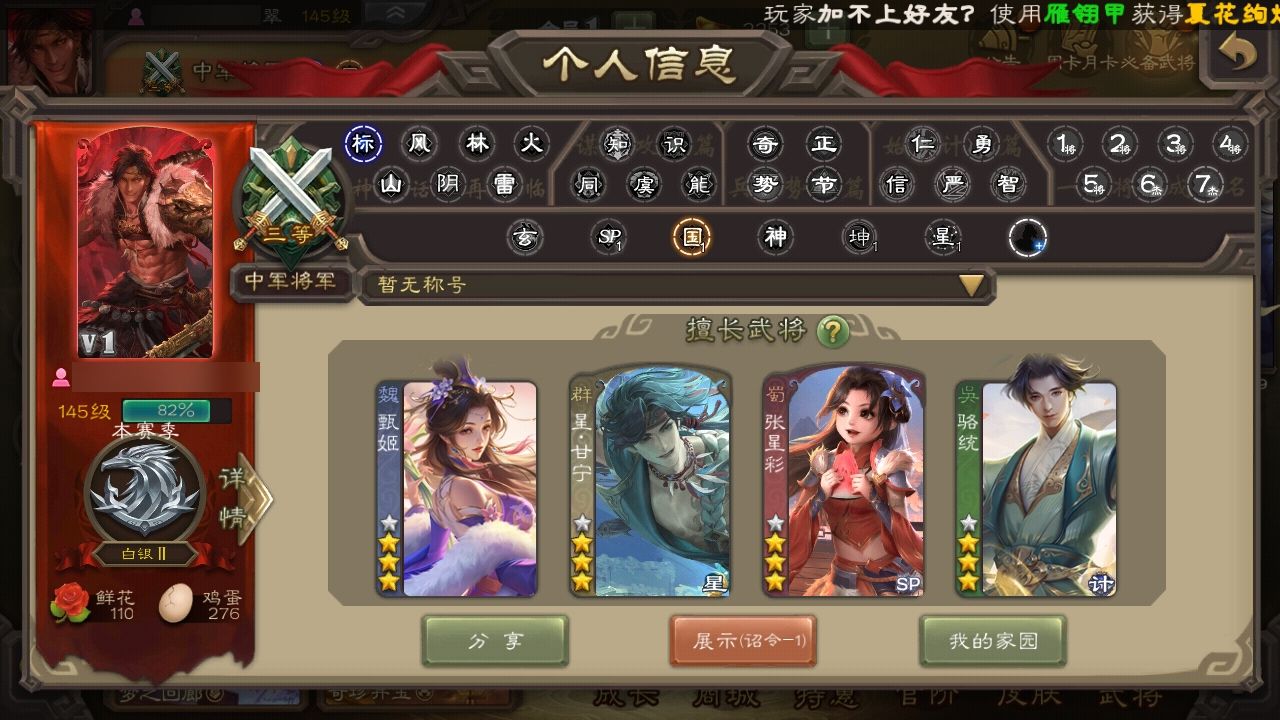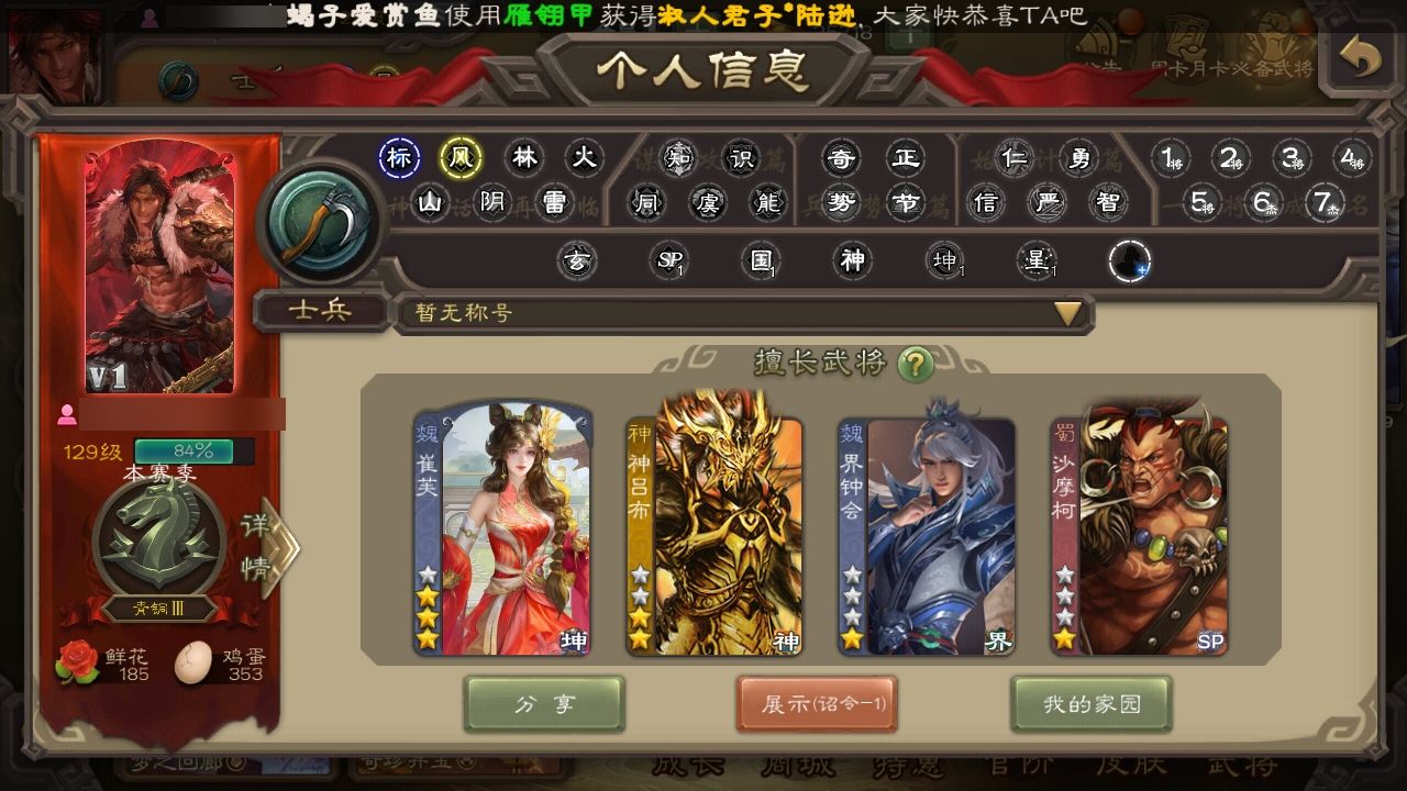 谋郭嘉三卡充足,精品武将多多,羽毛20000多,浆糊800