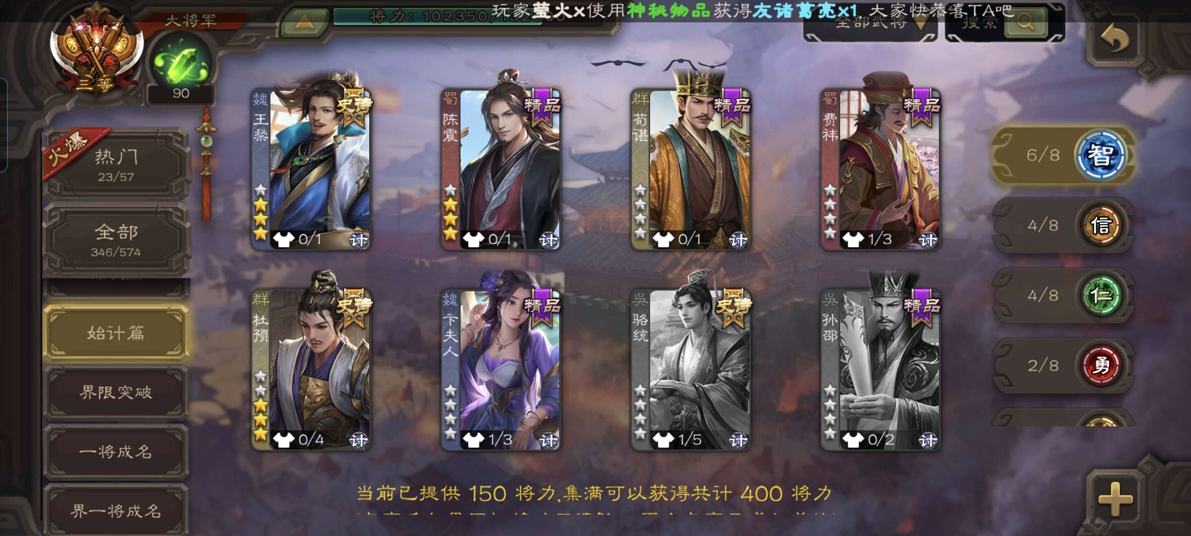 1.4万将魂9万羽毛6万豆,神刘备谯周双史诗先锋,谋卢植甘夫人界全琮势田丰154将