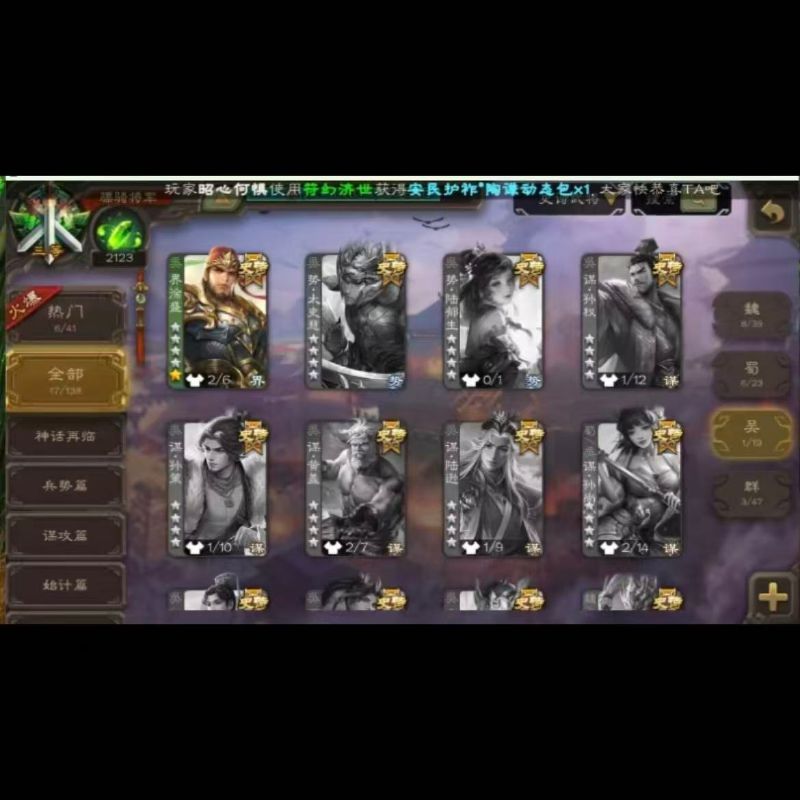 零充超级兵,谋关羽,蒋济,骆统,动态神吕布,界钟会,沙摩柯,谯周,界李儒,20宝珠,一万元宝,九千魂